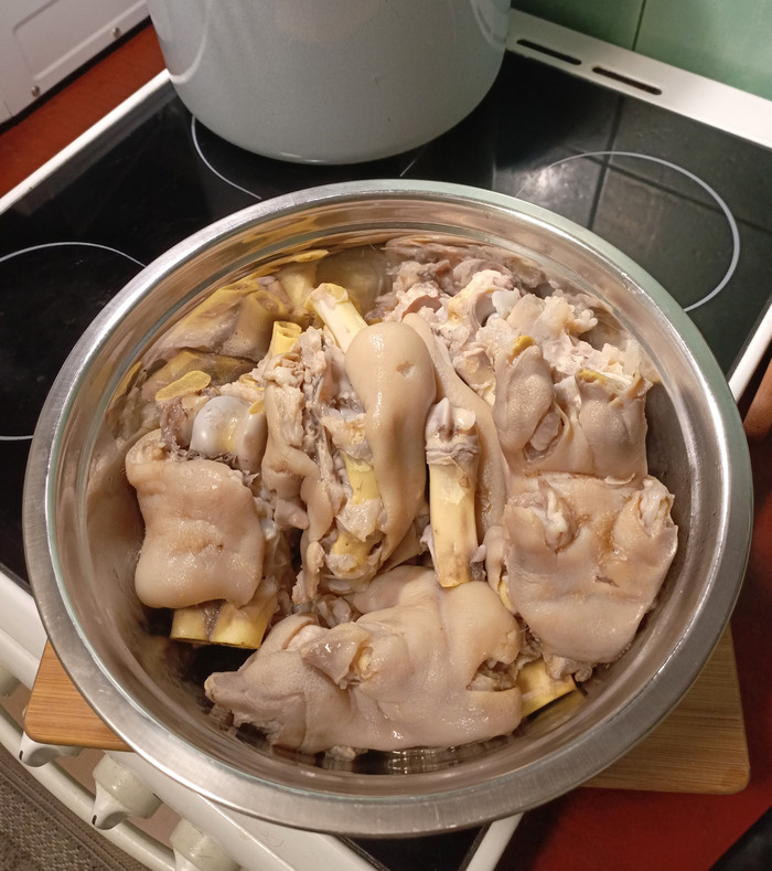 Сливаем первый мутный бульон, промываем ножки и кастрюлю, заново наливаем холодной воды и ставим вариться уже «по-настоящему».