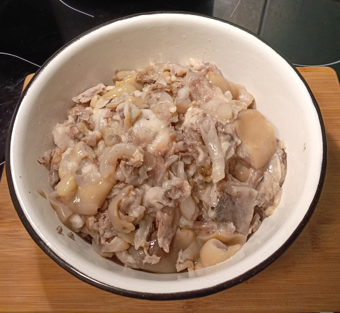 Вот что получилось из трёх килограммов ножек — около 1,3 кг шкурки, мяса и прочей соединительной ткани. Жира здесь нет — он практически полностью выварился и ушёл в бульон.