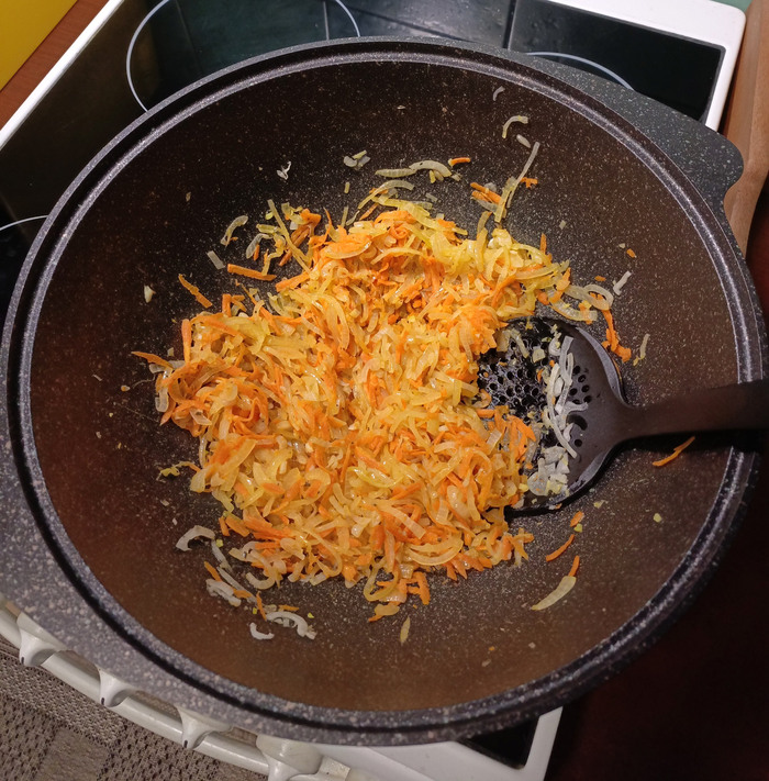 Дожидаемся, пока лук подразмягчится, добавляем морковь и пассеруем ещё несколько минут.