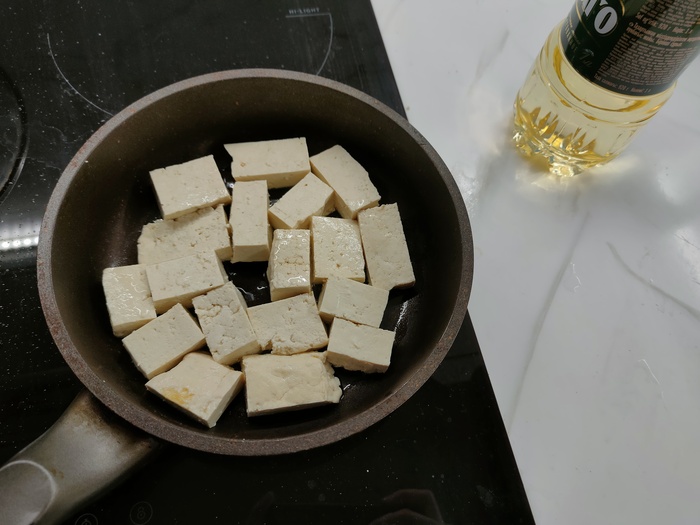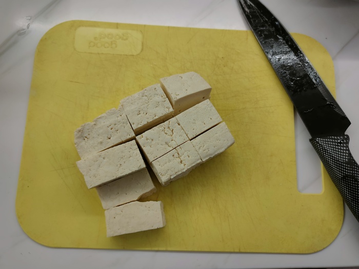Первым делом порежем наш тофу и обжарим с двух сторон