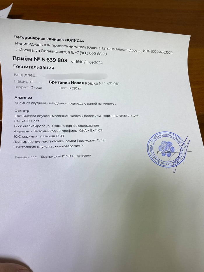 Но судьба не всегда бывает жестокой до конца. Её нашли. Её заметила добрая душа, которая не смогла пройти мимо. Теперь она в безопасности, но её борьба за жизнь только начинается. Опухоль растёт, и время не на её стороне. Британские кошки — сильные и выносливые, но даже им нужны силы и поддержка, чтобы преодолеть болезни. В её случае требуется немедленное хирургическое вмешательство, удаление всей молочной гряды. Время — её главный враг. Чем дольше откладывать операцию, тем больше шансов, что опухоль окажется злокачественной и начнёт распространяться по всему организму, поражая лимфоузлы и другие органы.