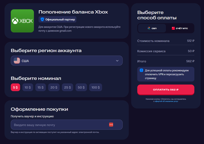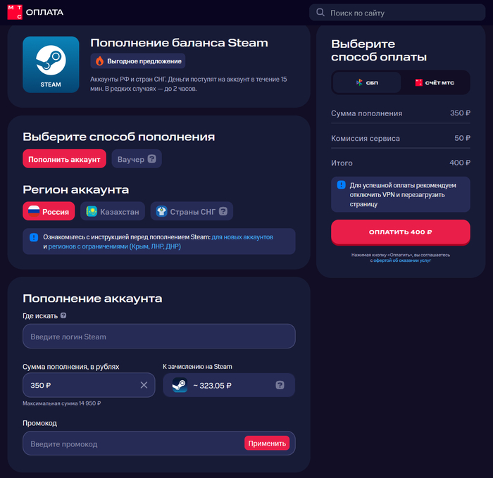 Оплата идёт через сайт МТС: вы выбираете сумму, оплачиваете по СБП, а деньги или код приходят в течение нескольких минут.