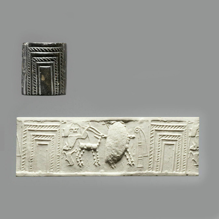 Иллюстрация 4. Цилиндрическая печать и её оттиск с изображение символического столба Инанны перед воротами храма | Ближний Восток, Месопотамия | Бронзовый век, период Джемдет Наср, 3100-2900 годы до нашей эры | коллекции Лувра, отдел ближневосточных древностей