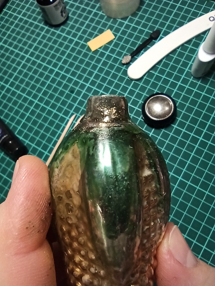 Почему фигня? Потому что во-первых, я размазала гель по зеленому, не стерла его, и втирка прилипла не только на топ, то и на гель. А стирать гель не так и просто, он уйдет в паре с краской на таких старых игрушках. В идеале все, где есть гель, где его размазала кисть - должно уйти под топ, и втирка сядет только на него, со стекла она слетает.