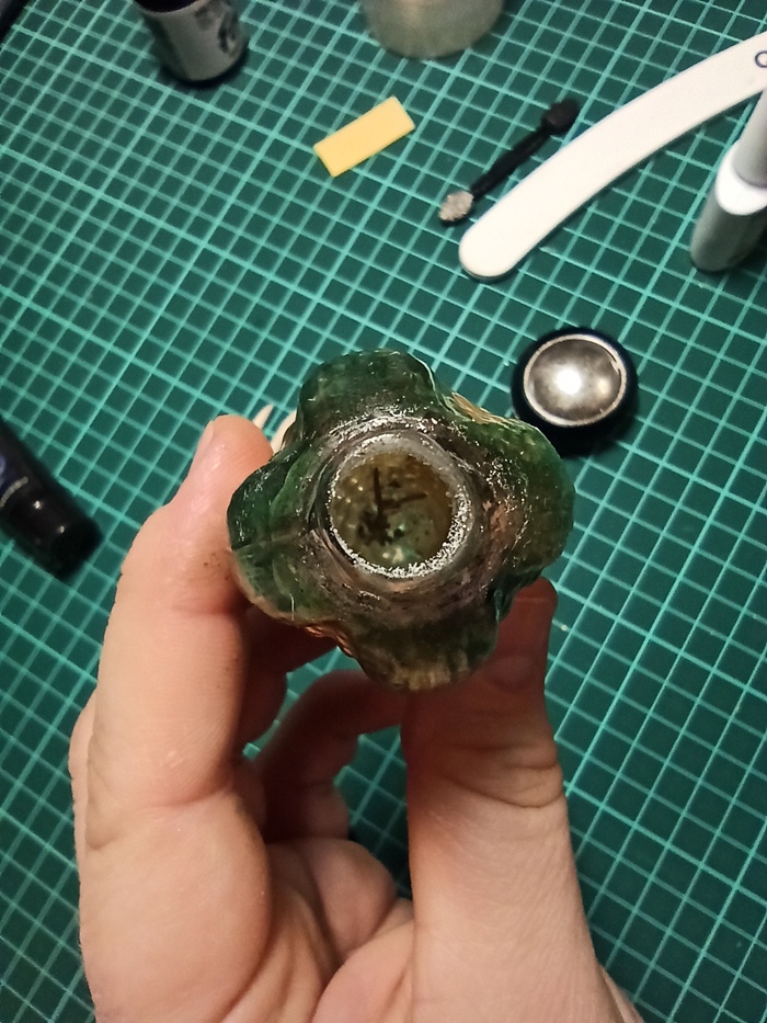 А еще я иногда, если позволяет характер скола, наращиваю его изнутри. То есть вот все то же самое, но внутри трубочки делаю. Все наплывы получаются незаметны, надежность не страдает, снаружи все значительно аккуратнее, края стекла как будто вплавлены.