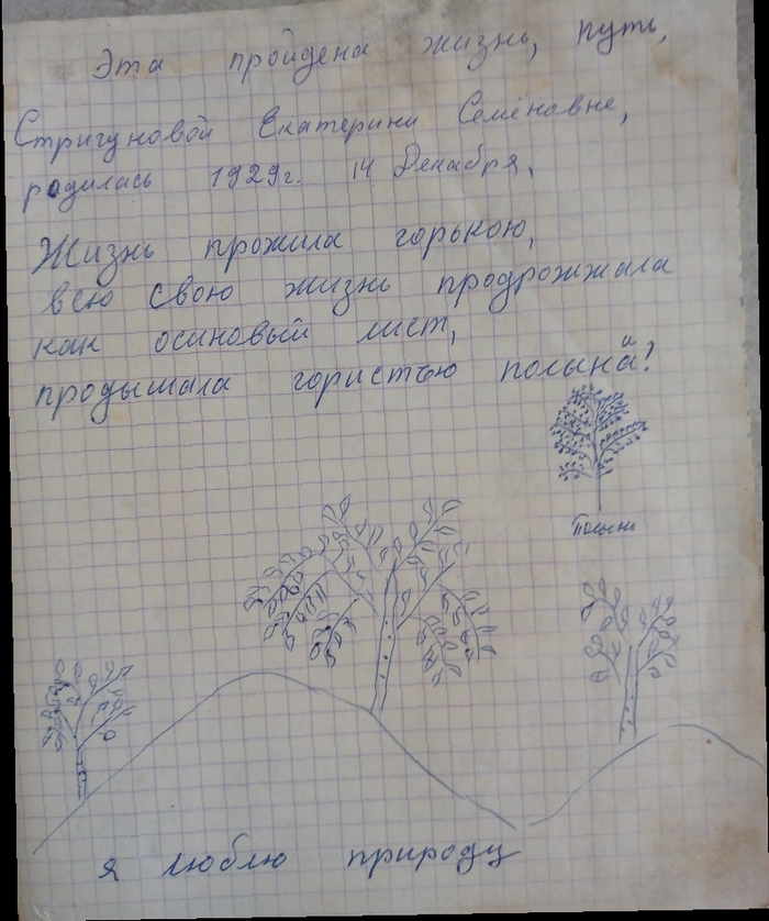 Когда мы приехали с Балхаша в Горный, я сильно скучала, долго не могла привыкнуть, мне на Балхаше нравилось. Пришла весна, закуковала кукушка, а у меня разрывается сердце от тоски. И думаю заделалась бы я кукушкой, и стала бы куковать. Но через долгое время привыкла. Здесь в Горном, Алеша стал пить и изменять мне, связался с одной женщиной замужней, когда я узнала, начала его выгонять, он струсил. Я ходила к этой женщине домой, Мария звали ее, но я не ругалась с ней, я не умею ругаться, а просто поговорила, и это подействовало на нее и на него, я ему приказала уволиться с этой работы, так как они работали вместе, и он сразу же уволился, я взяла отпуск и мы поехали в Камень-на Оби, туда уехал его друг механик, вот он и созвал туда за рыбой, там в Оби очень хорошая рыба. Взяли с собой Нину и поехали, доехали до Бийска и я уперлась не поеду дальше, он меня уговаривал как маленького ребенка, и я все же согласилась. Доехали до какой-то станции и там ждали нас поезда, он меня начал укладывать спать, уж он меня укладывал, укрывал, углаживал, весь народ на нас внимание, вот скажут какие счастливые, а сам ушел с Ниной в столовую, я полежала не много, и думаю что их долго нету, и встала, слышу люди говорят дольше укладывал, чем она лежала, видишь какие люди ненавистные, если одному человеку хорошо, то других бесит от зависти.