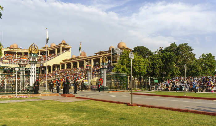 По обеим сторонам границы установлены трибуны для зрителей. На пакистанской стороне их не так и много, но вот на индийской выстроено нечто вроде Колизея с местами на несколько тысяч человек