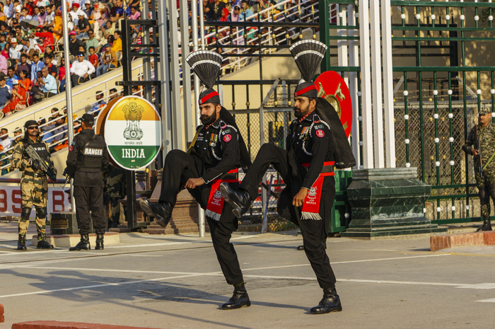Пост находится неподалёку от Лахора с пакистанской стороны и Амритсара с индийской. И с 1959 года там проходит ежедневная вечерняя церемония спуска государственных флагов. И это просто чумовое зрелище!