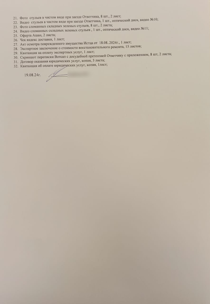 В итоге утром второго дня проснулись и начали собираться. Посуду помыли, мусор убрали, написали контактному лицу и стали ждать отъезда. К 11:00 пришла девушка – передали ключи и получив ответ, что больше ничего не нужно спокойно уехали. И тут становится вопрос возврата 18 000 залога и 3300 за не приехавших 3 гостей. Внутренне понимаю, что с таким подходом можно ждать всякого. В итоге после пары напоминаний получаю претензию за сломанные стулья, которые мы увидели в таком состоянии.