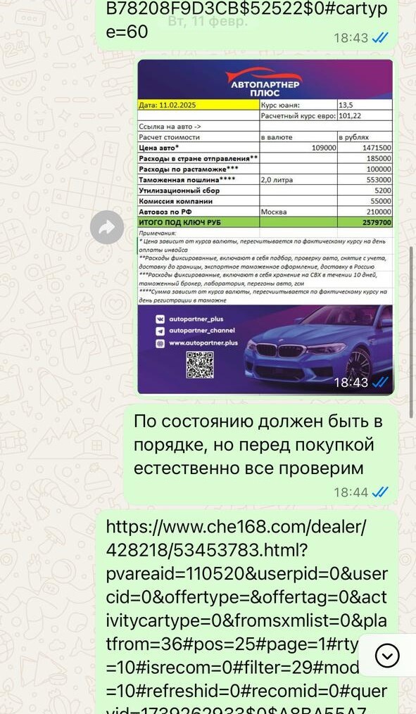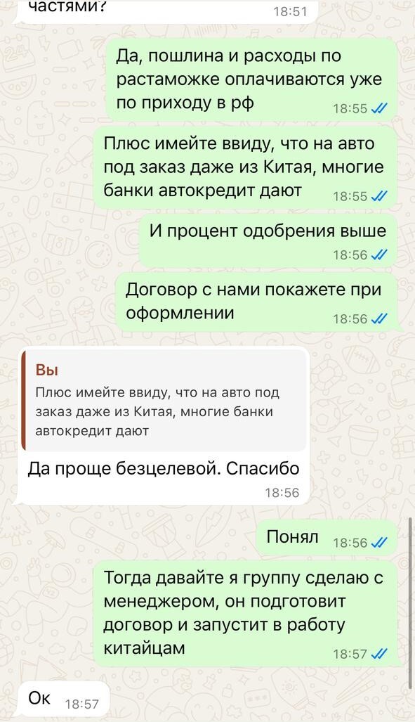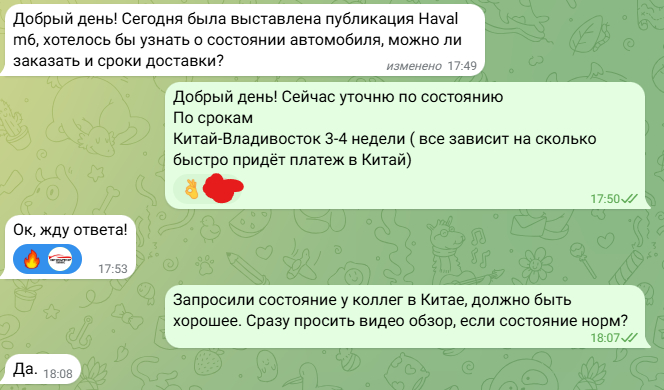 Через час, после отказа от прохождения диагностики, коллеги в Китае отправляют сообщение, что продавец не хочет ехать самостоятельно на осмотр (т.к. диагностический центр находится не в его городе), поэтому и отказался от него. Коллеги предложили, что сами вывезут авто на осмотр - клиент возражать не стал.
