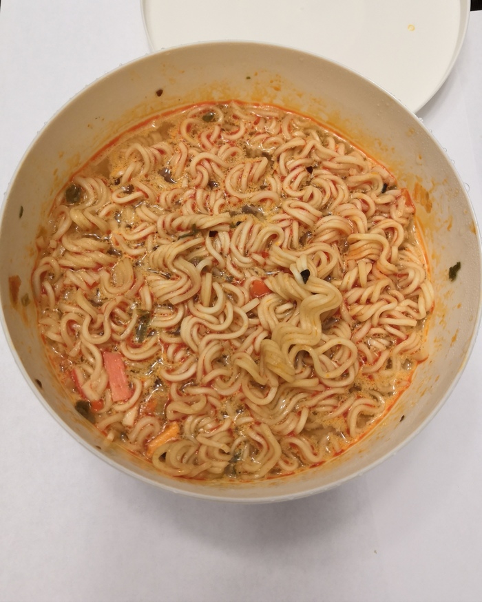 Способ приготовления как всегда прост, все всыпать, залить, подождать, перемешать. Кушать подано. Надо отметить, что в описании написано, готовность 3 минуты, но это не так, тк обжареная лапша имеет более плотную структуру, время заваривания мы увеличили вдвое. А морковь(будь она не ладна, не люблю её) так и осталась хрустящей и даже не собиралась делать вид, что она приготовлена.