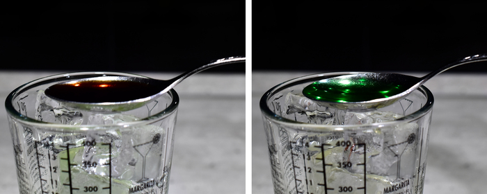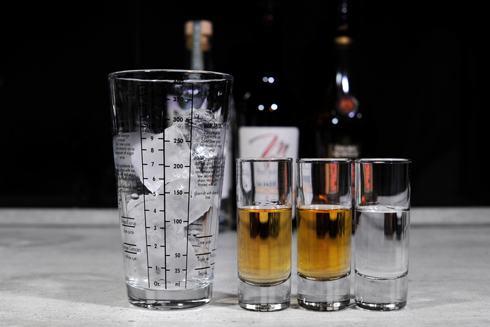 Закидываем лед в смесительный стакан, вращаем - охлаждаем, сливаем воду.