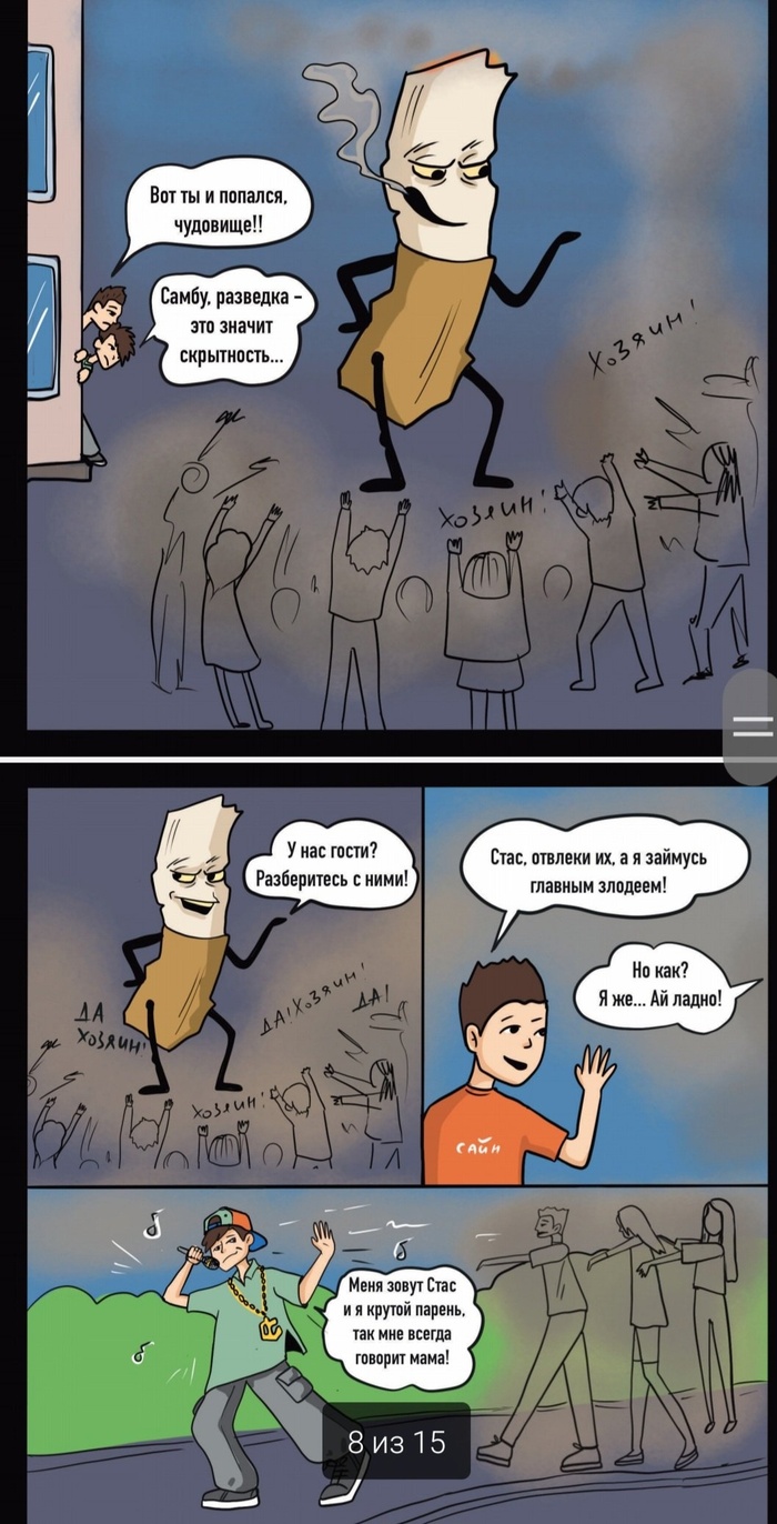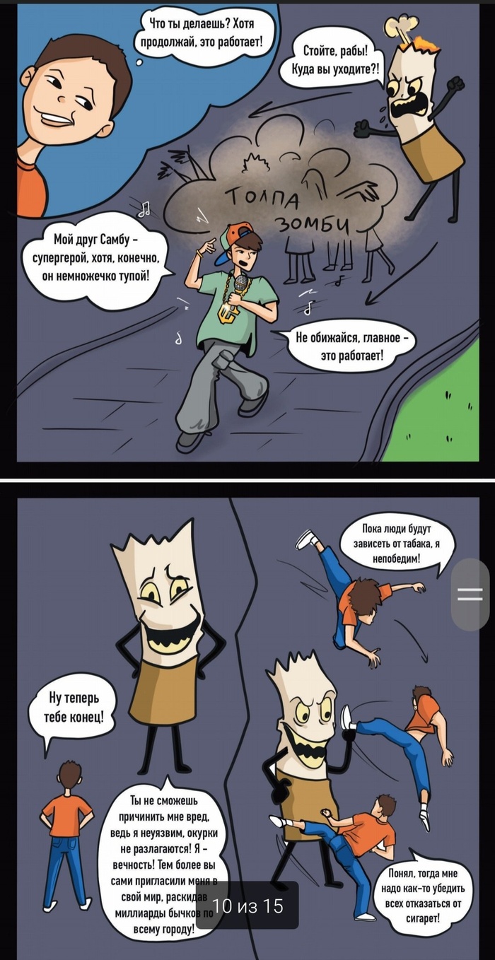 На этот раз герои Стас и Самбу, у которых есть приложение суперсилы добро.ру, противостоят никотиновым зомби под предводительством повелителя окурков.