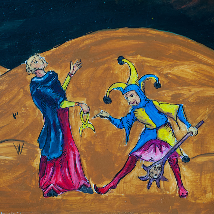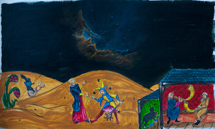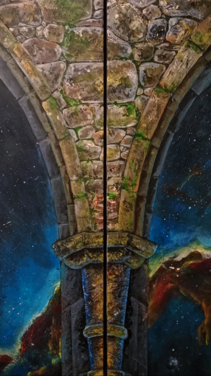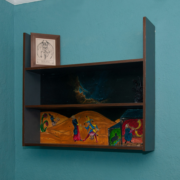 Морду шкафью в черный загрунтовали, бока в пролетарский серый покрасили - тут буз изыска. На картинке решили поженить средневековую книжную миниатюру и космические снимки телескопов. А чё бы и нет? Рисовали акрилом. Можно было б и маслом, но эта история растянулась бы года на пол.