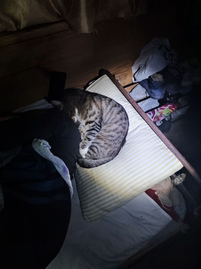 С этого дня мы утром и вечером оставляли миску с едой, но кот был в режиме "стелс" и особо не показывался. Днем предпочитал спать на сене, за коньком погреба.
