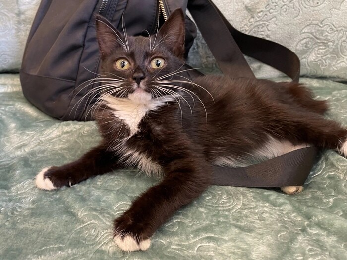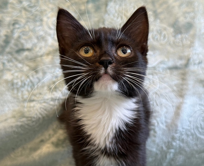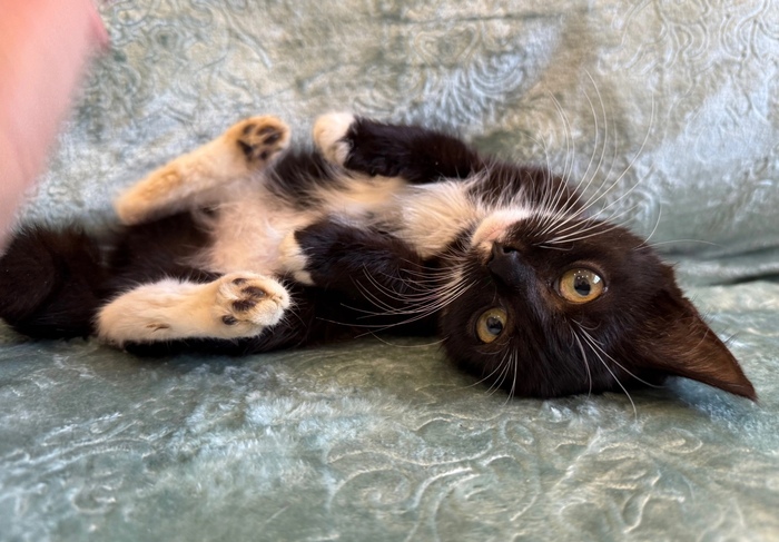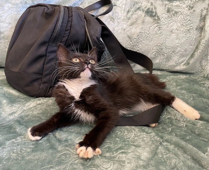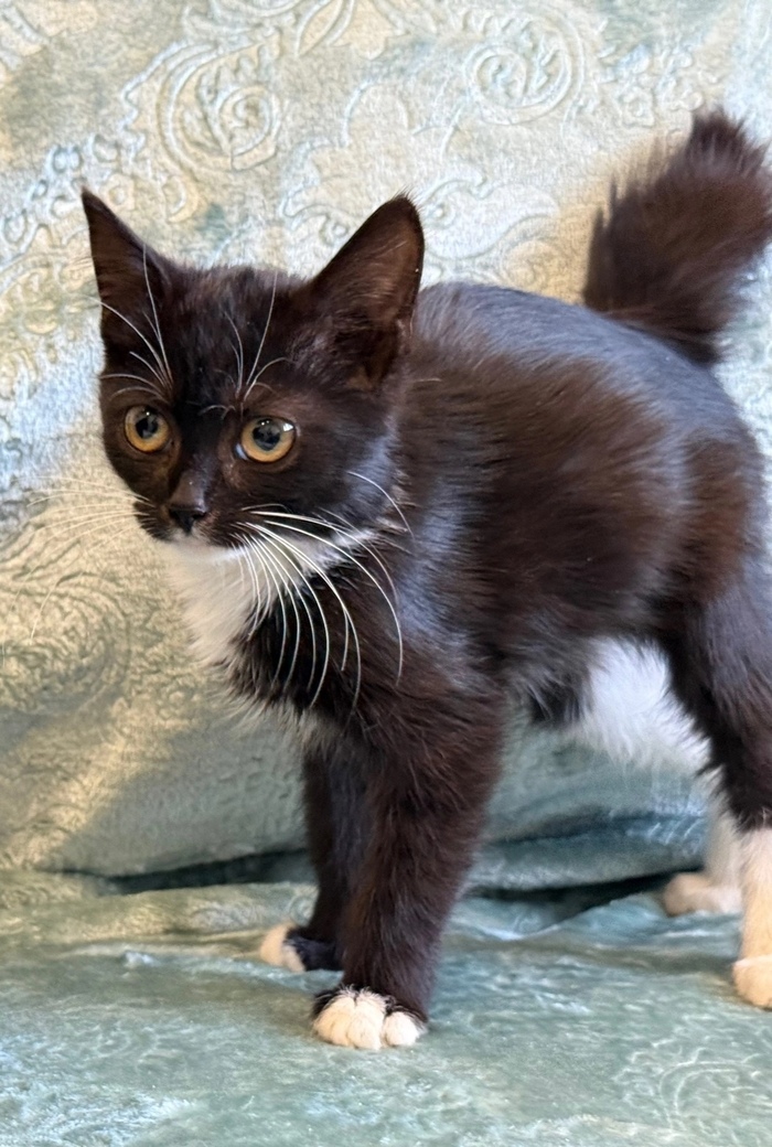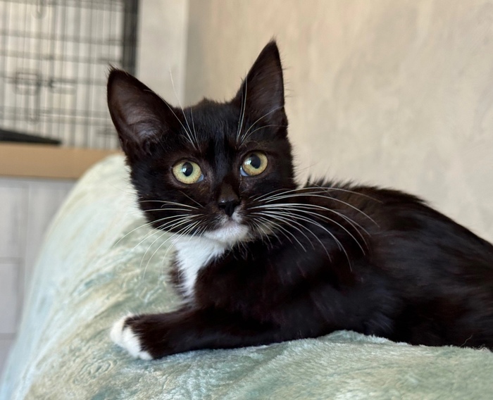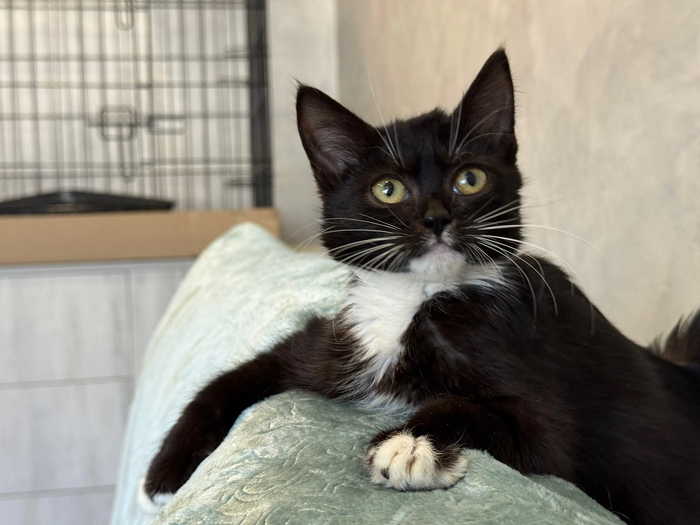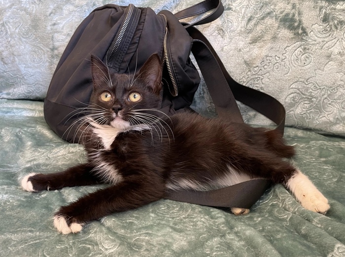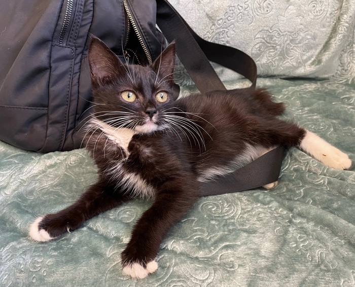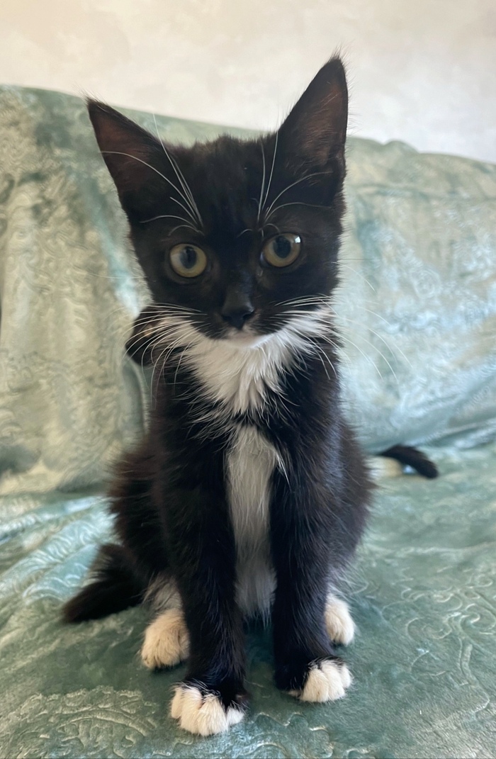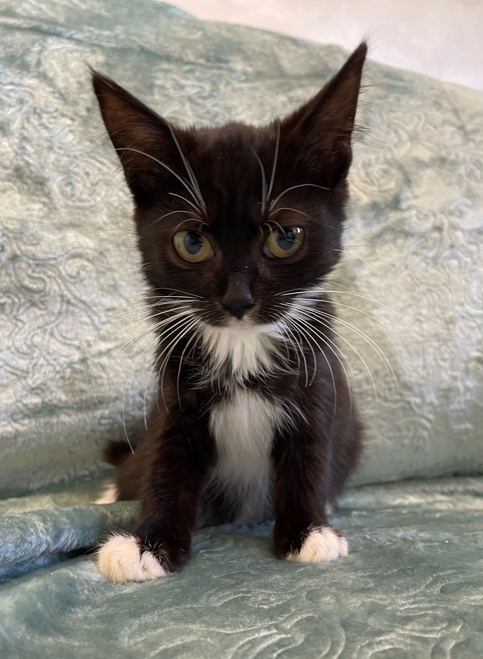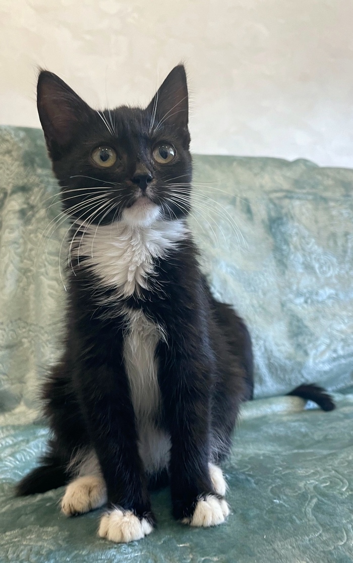 😺Привет, меня зовут Бэтти и я очень хочу найти любящую семью. Посмотри, какой у меня элегантный костюмчик: черный с белым. А ещё у меня белые перчатки и белые носочки...