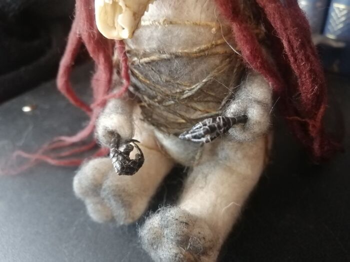 Тело и дреды сваляны из шерсти. За основу была взята шерсть моей собаки, а наружная часть тела, лапки и дреды — из остатков покупной шерсти для валяния.