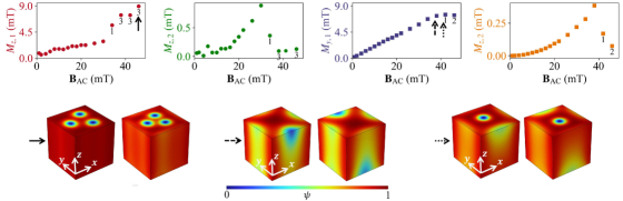 Зависимость амплитуды первой и второй гармоник намагниченности от силы переменного поля демонстрирует, что при фиксированном постоянном поле, продольная и поперечная возбуждения приводят к различным откликам: продольное возбуждение преимущественно влияет на компоненту Mz,₁, в то время как поперечное - на My,₁, а наблюдаемое количество вихрей в квазистационарном состоянии коррелирует с параметрами возбуждения, при ωB=1 { рад/нс}, κ=3, λ=60 { нм} и a=h=250 { нм}.