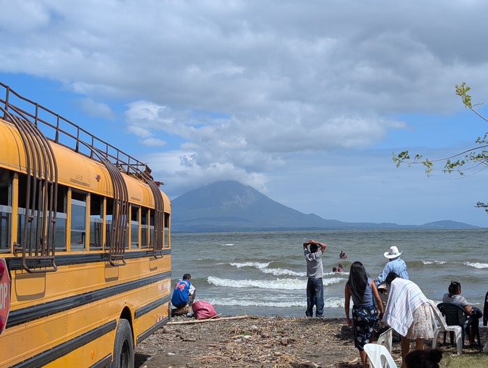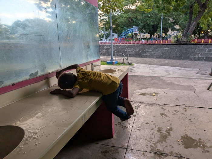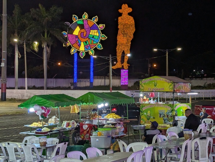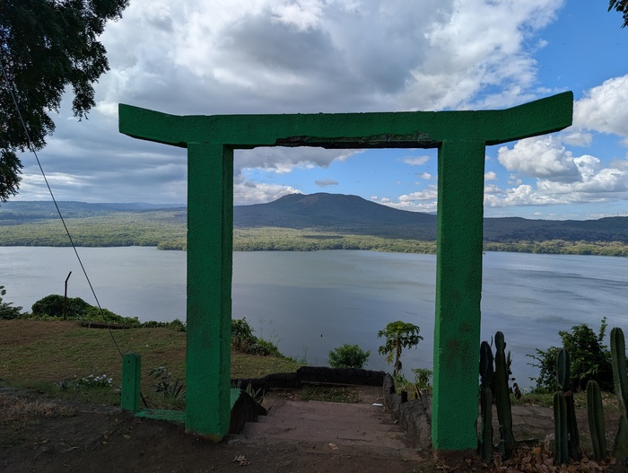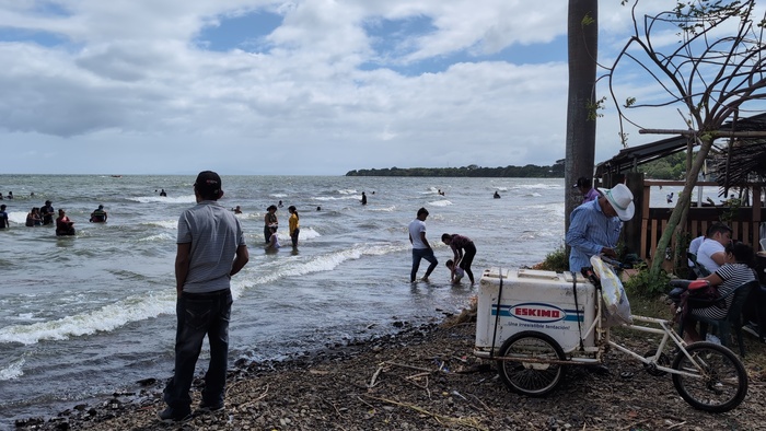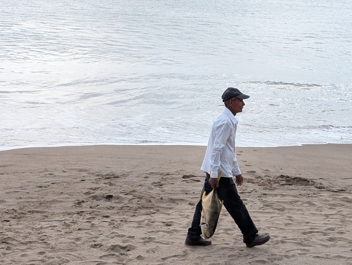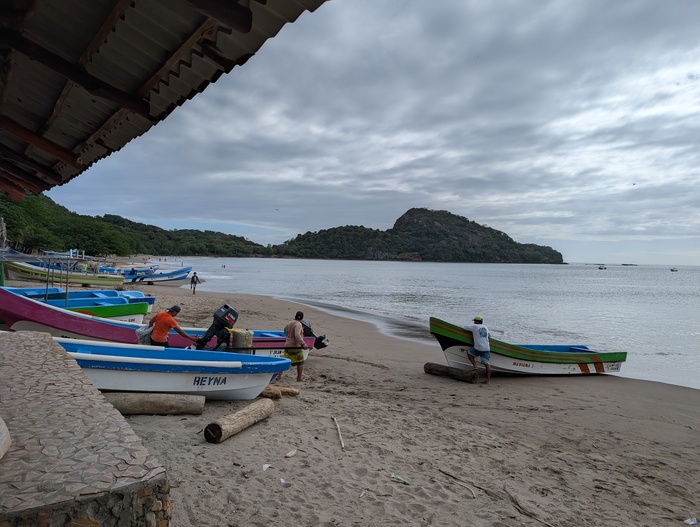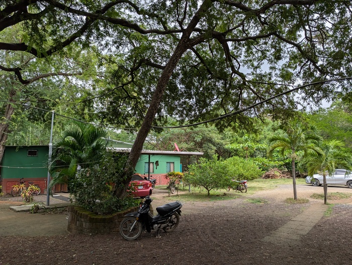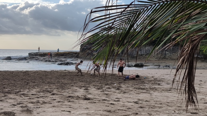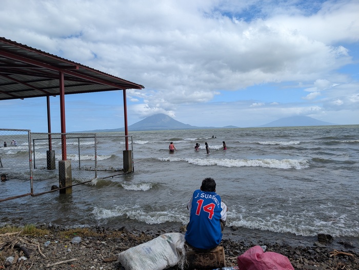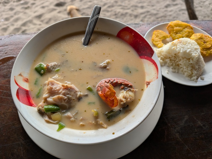 Наконец, нашел океан, куда ходят местные. На бамбуковые ветки натянули рекламные баннеры, клеёнку и остатки упаковки от кока колы. Выглядит сомнительно, но в теньке можно запарковать машину и поваляться в гамаке. Отдельные части побережья контролируют разные семьи, и зорко следят, чтобы воду ты покупал только у них. Стоит парковочное место $5. Также поел рыбного супа за $2 с видом на море.