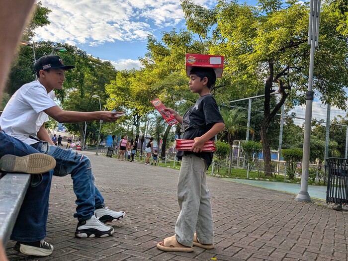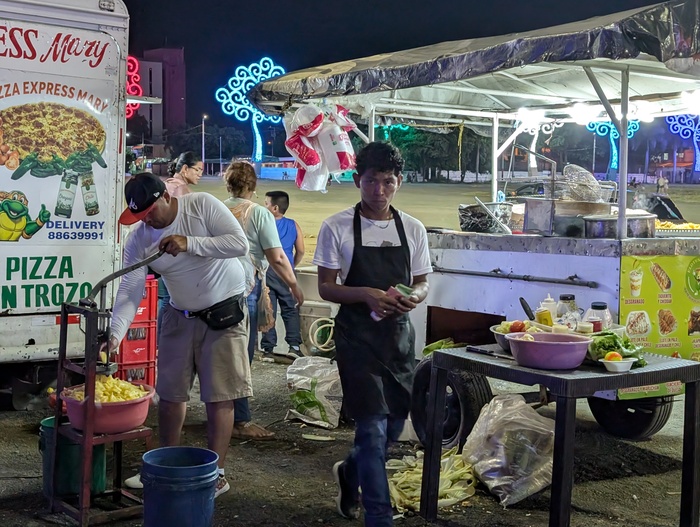 Любопытно, что ни разу не видел попрошаек. Все что-то продают: Детвора детсадовского возраста снуют между транспорта и продают воду, фрукты, зонты, шляпы и рога и копыта. На светофорах постоянно снуют дяденьки-протиральщики окна и фар. Тетеньки продают какие-то пирожки из банановых листьев. На особо опасных участках можно даже заплатить какому-то дядьке с нарисованным на фанере знаком Стоп, чтобы он через дорогу перевел.