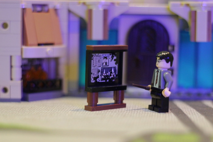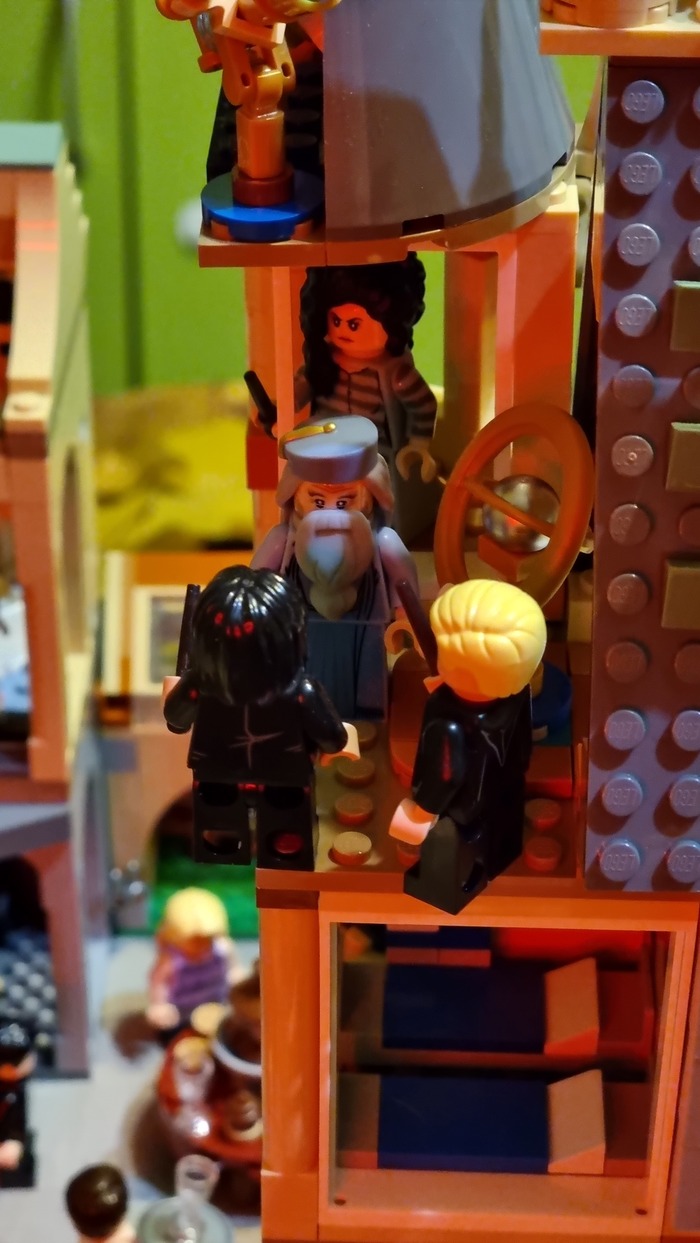 Сейчас в кабинет Дамблдора в часовой башне я перенесла Фоукса и распределяющую шляпу из набора Большой зал, а ещё омут памяти от серийной минифигурки Дамблдора.