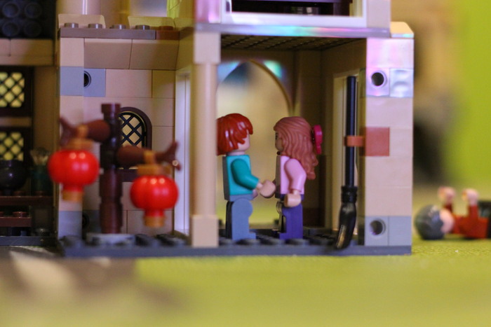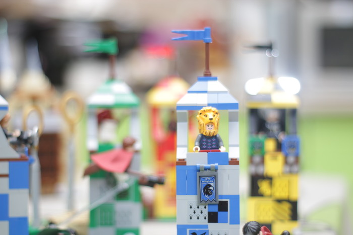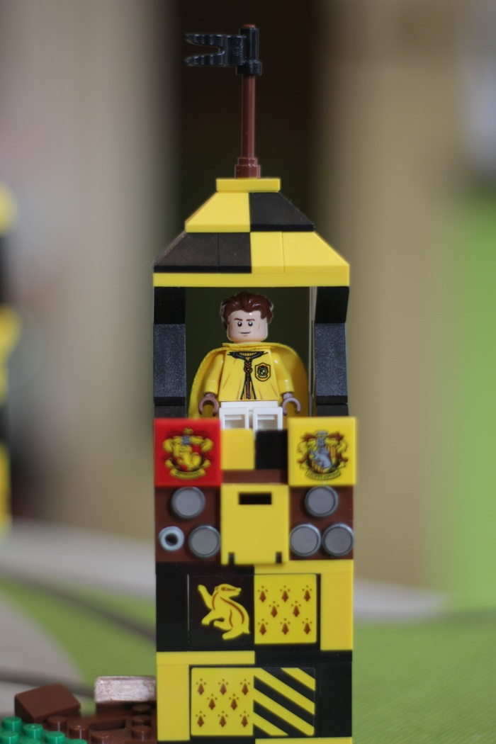 На трибунах своих факультетов расположились Полумна с головой льва (из второй серии минифигурок), Дин Томас с флагом факультета (из перврй серии минифигурок) и Седрик в форме квиддича (из книги "Давайте играть в квиддич")