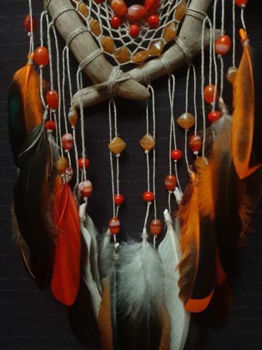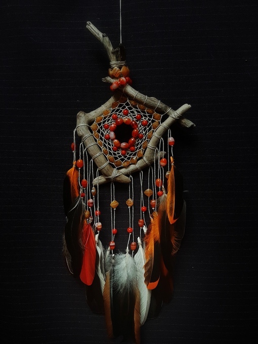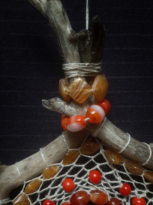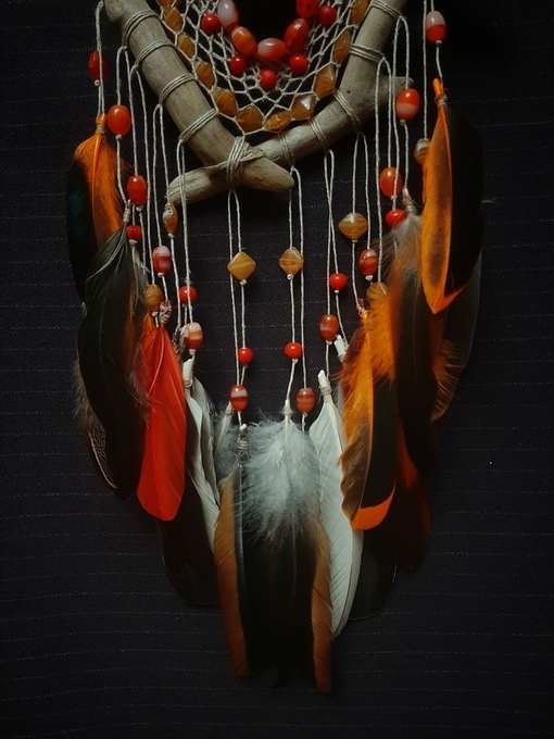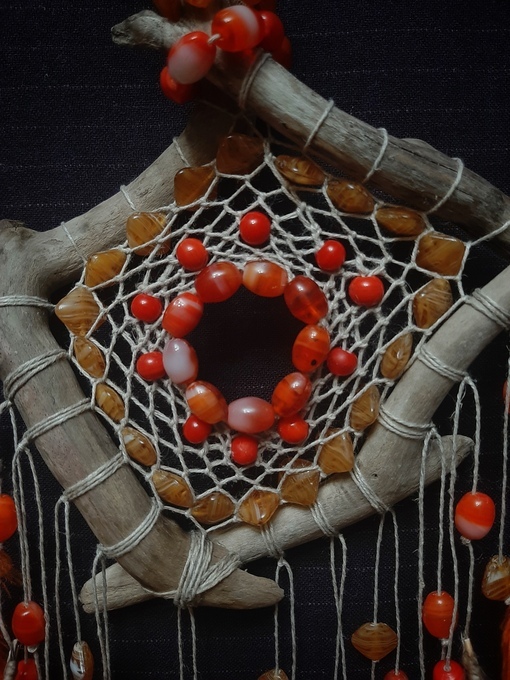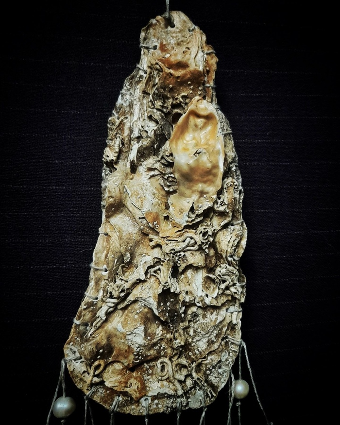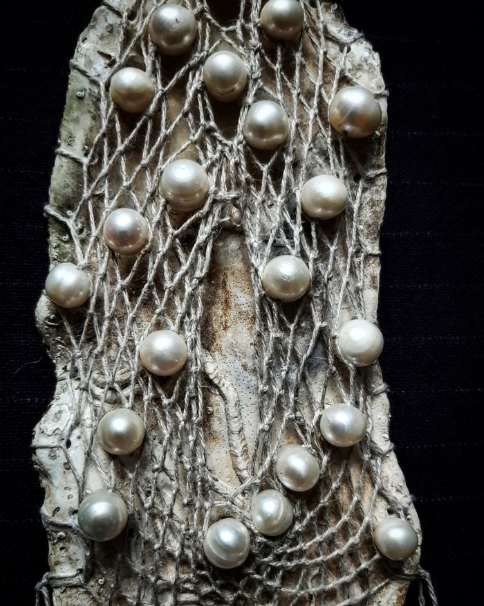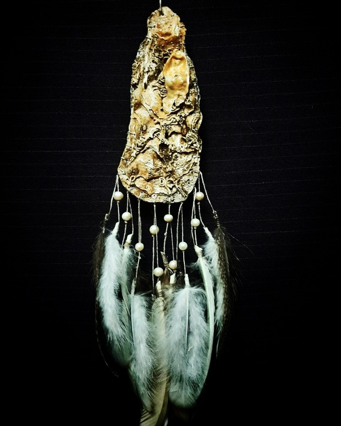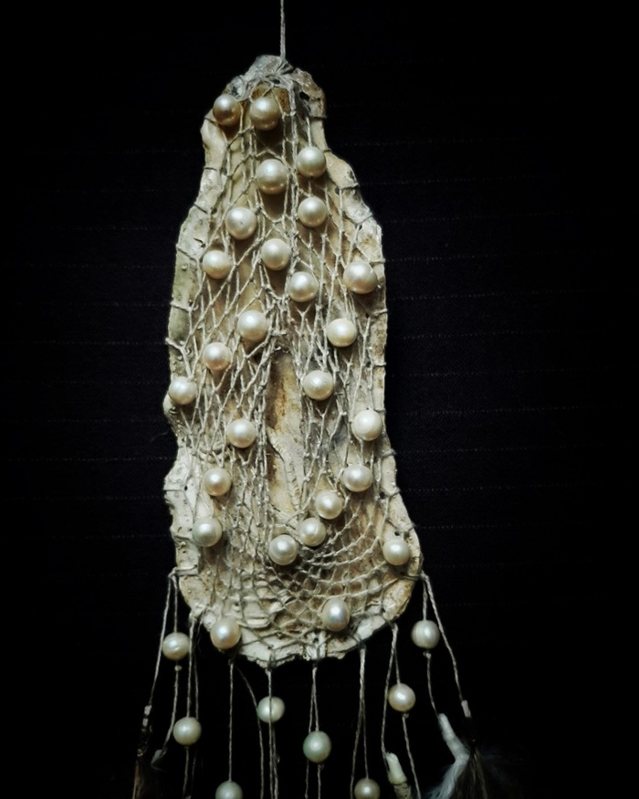 Материалы: основа из ракушки, нитки из льна, бусины из жемчуга, натуральные перья.