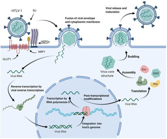 Более подробно: вирион (полноценная вирусная частица) HTLV связывается с белками клеточной стенки и попадает внутрь. Там он высвобождает вспомогательные молекулы и цепь РНК, на основе которой обратная транскриптаза строит ДНК. После формирования цепочки вирусной ДНК её подхватывает интеграза, затаскивает в ядро и встраивает в ДНК человека, превращая в провирус. И – Game Over, человек становится пожизненным носителем, ибо никакими стандартными методами вытащить провирус из генома невозможно.