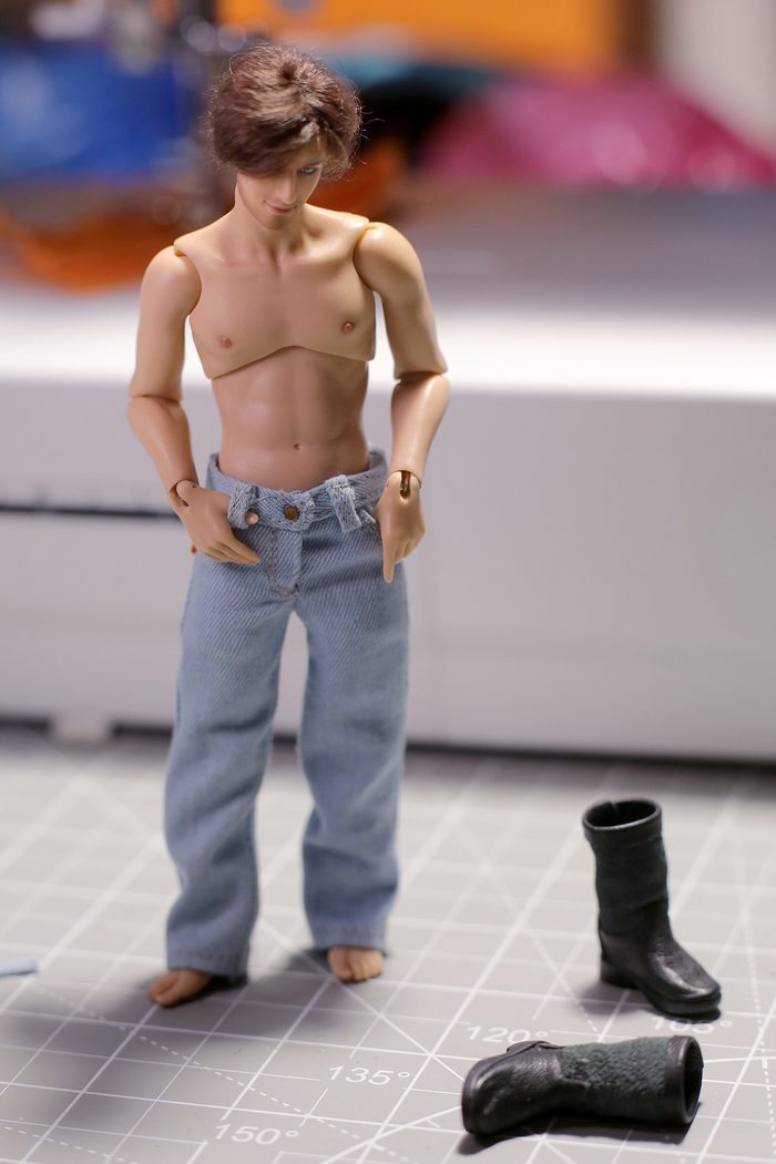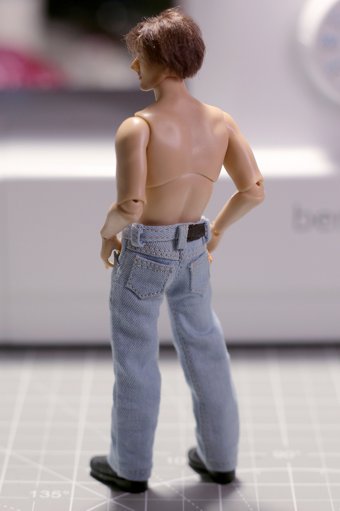Недавно вспомнила, что где-то в витрине у меня стоит маленький шарнирный кукл, и одет он непонятно во что. Был срочно найден, "непонятно что" отправилось в помойку, а я взялась шить новую одежду. И начала, как всегда, с любимых мною джинсов.