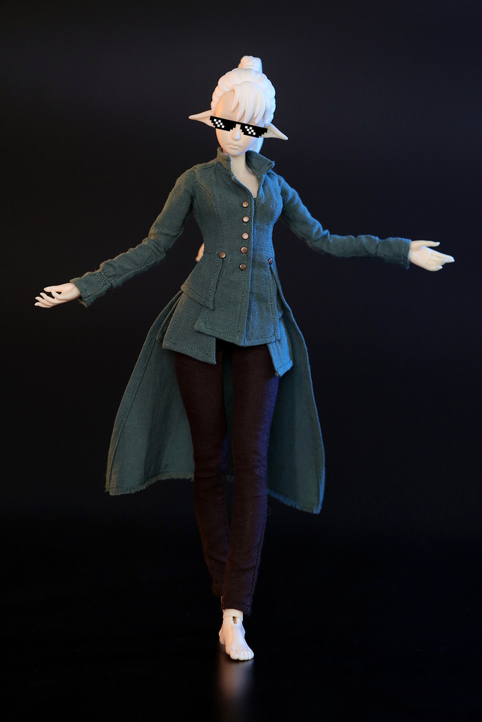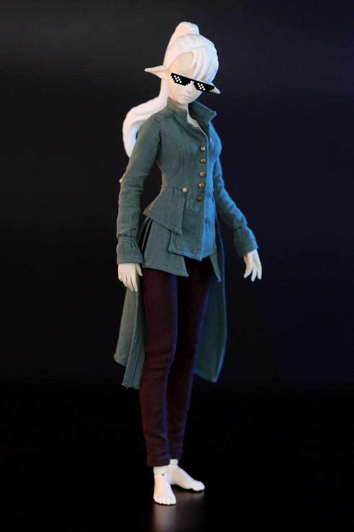 Привозили мне на одевание тощую эльфийскую тушку 33 см ростом. Попросили что-нибудь фэнтезийное, накидали референсов, я сняла с тушки макет верха и построила низ. Затем были два дня задумчивого шитья, ибо в целом технология мне известна, но в формате а-ля Барби есть свои нюансы. В итоге получилось нечто фэнтезийно-милитаристское с закосом под мундиры 18-го века.