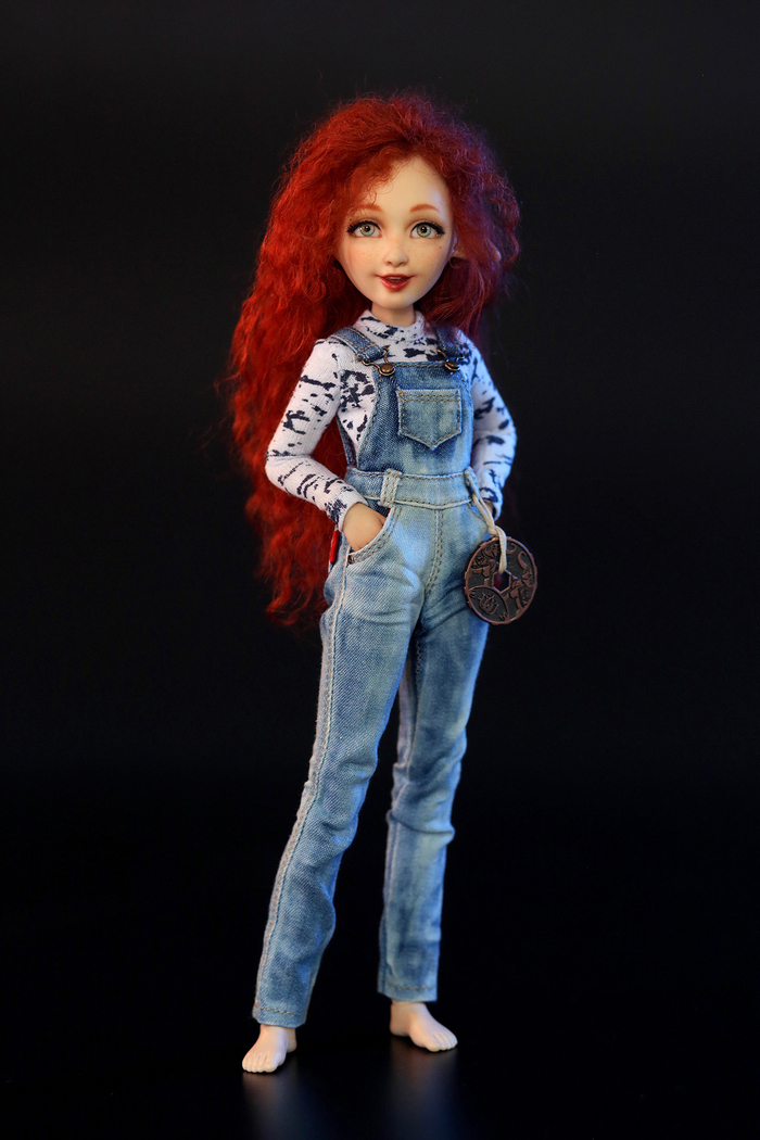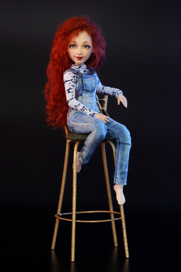 Ну а потом я вспомнила, что у меня тоже сидит совершенно голая и грустная эльфочка. Только здесь уже роста всего 24 см, и объемы значительно меньше, чем у предыдущей. Решила не усложнять себе жизнь и сшила ей простенькую водолазку и комбинезон. Чисто чтоб голой не сидела, осень всё же.