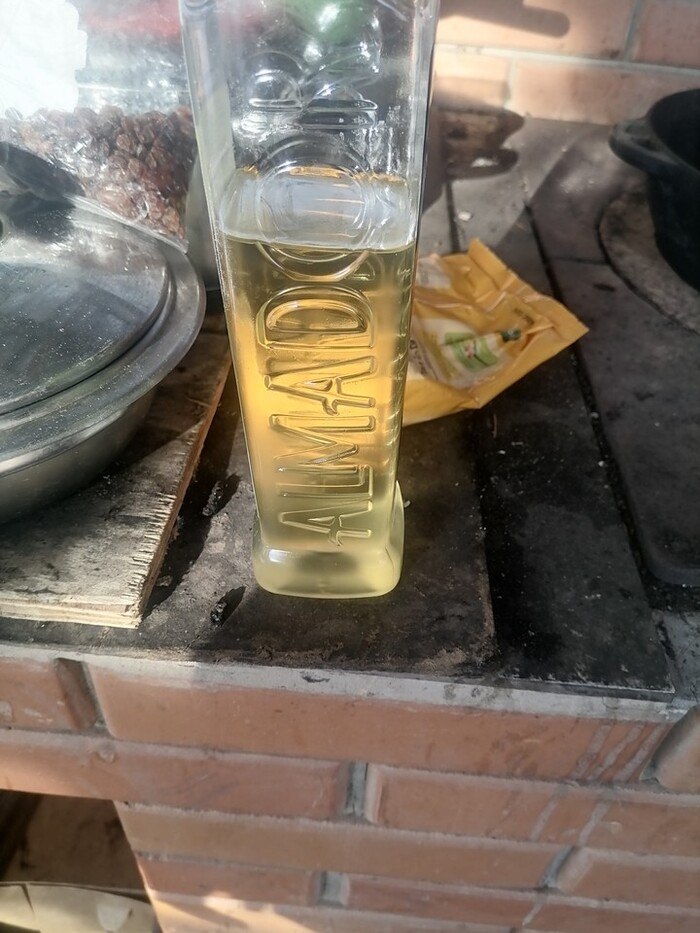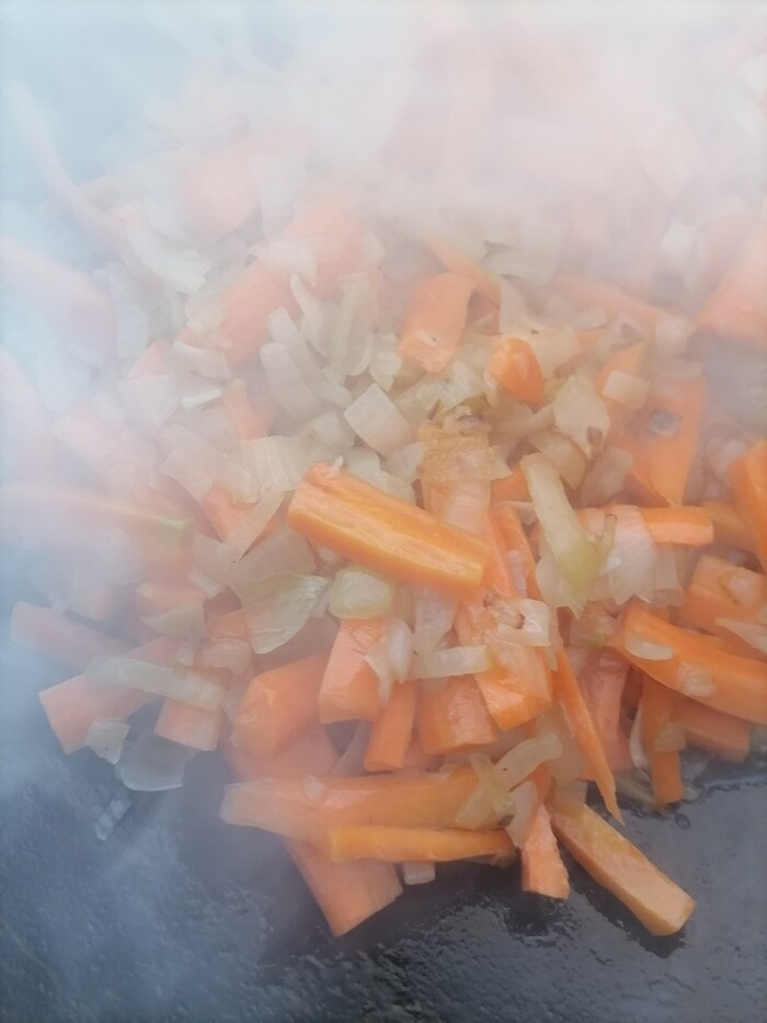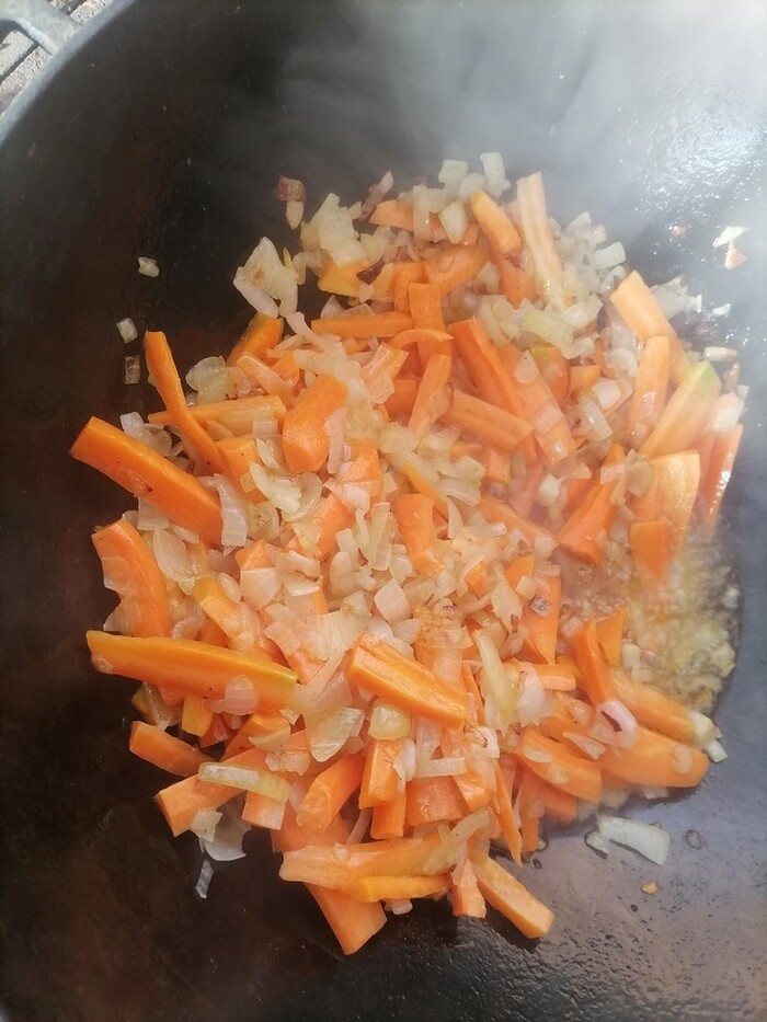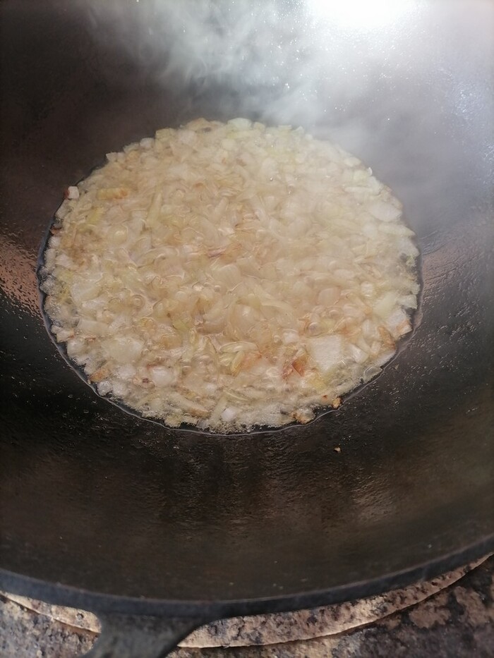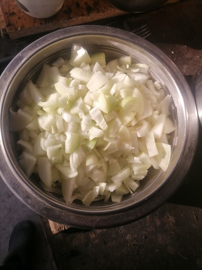 А мы помним, что на улице -16. И масло при такой температуре становится очень вязким. Накачал его в казан, выдавливая, как из тюбика. Засыпал лук. Смотрю как прожаривается, с постоянным помешиванием.