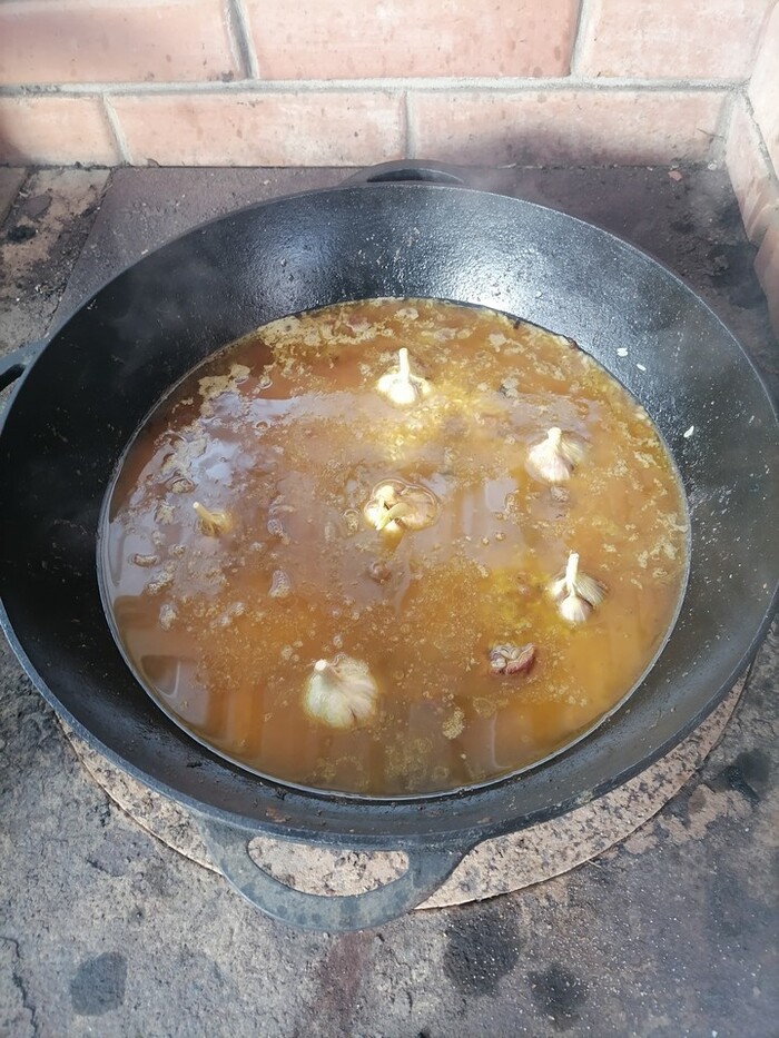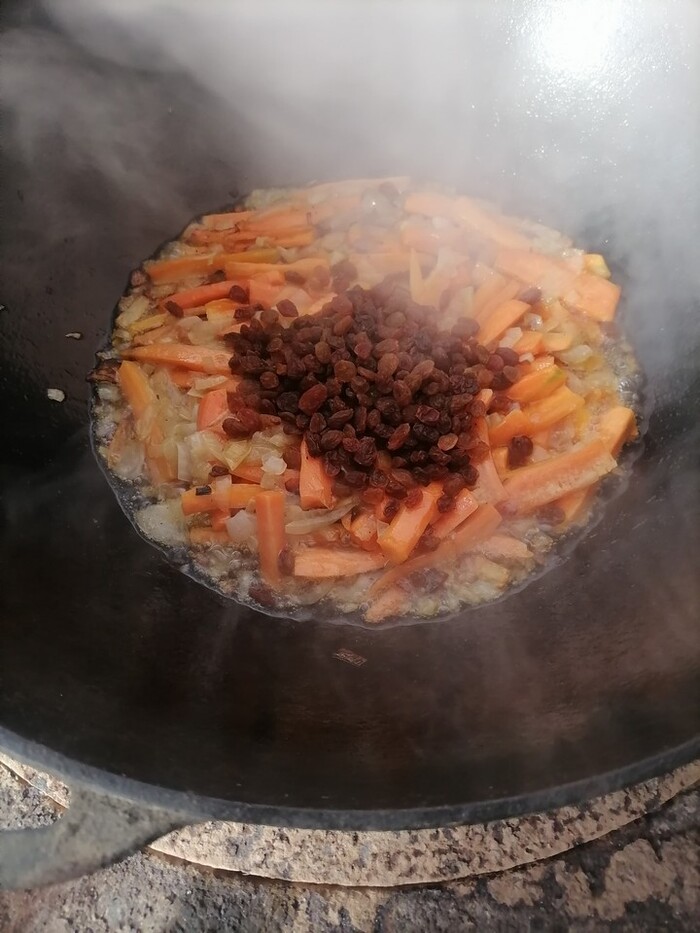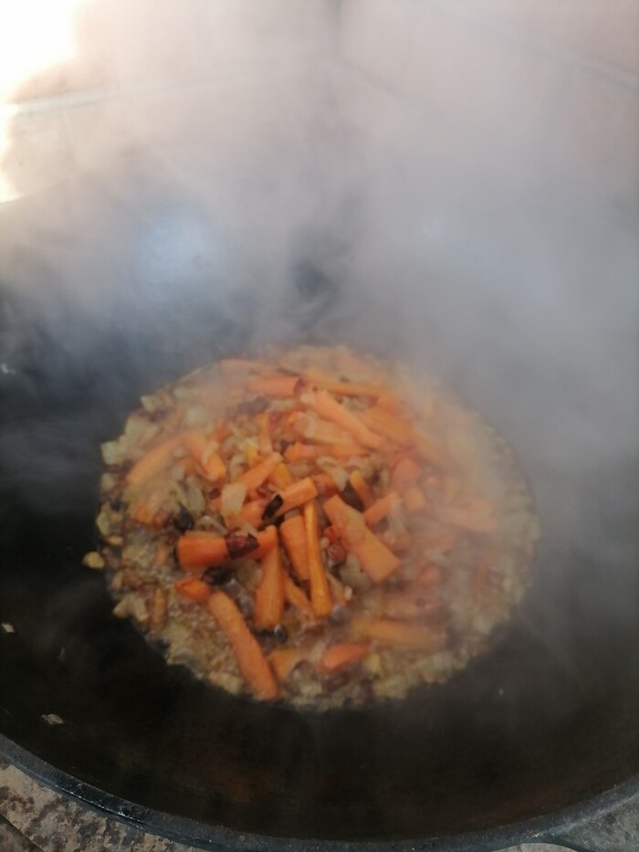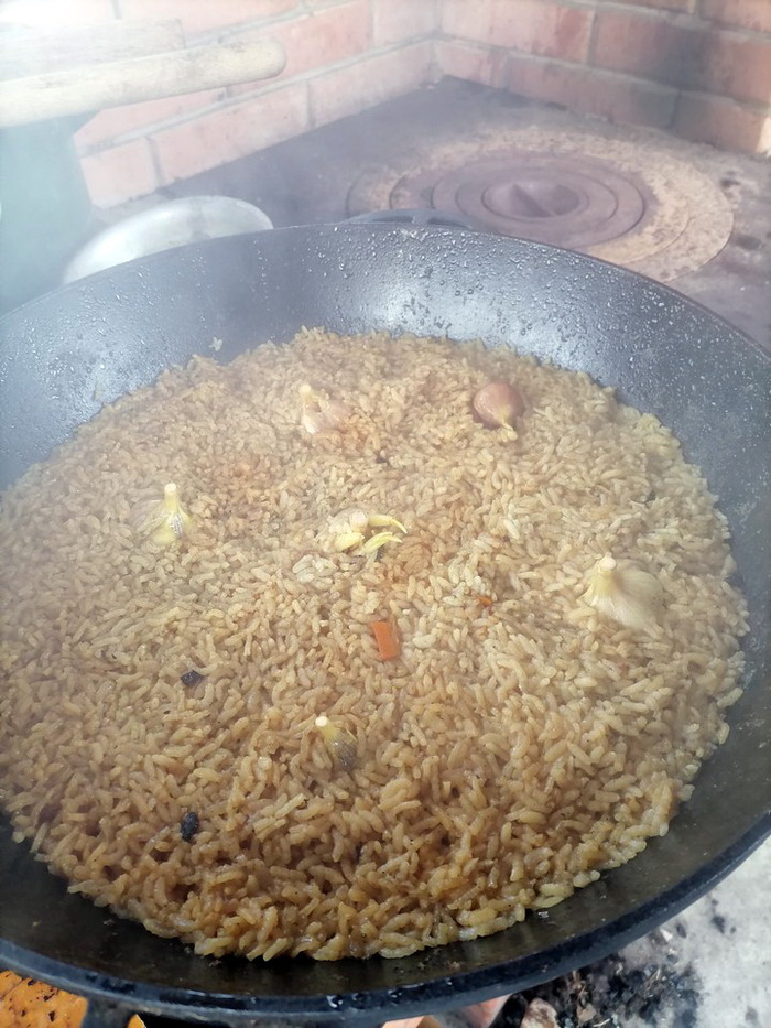 Засыпаю рис в казан. Доливаю воду. В топке от дров практически остались только угли. Я дрова больше не подбрасываю, даю потомиться плову на медленно догорающих углях.