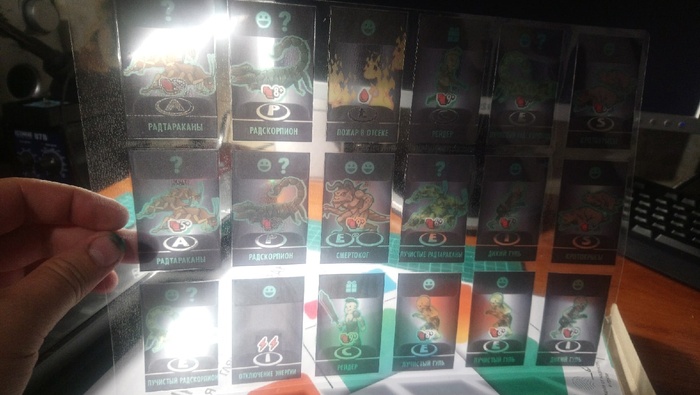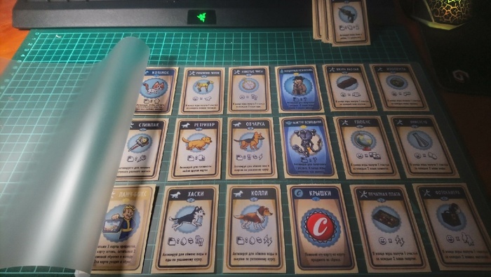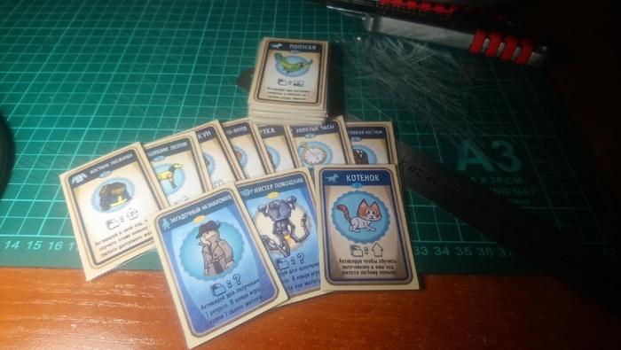 Вот такую игру я сделал. Выложу на днях подробный, длинный пост со всеми подробностями. Надо всё подготовить. Много информации и изменений с момента этой фотографии. Фото с тестовой партии, всё играется отлично. Извиняюсь за качество фотки, делал уже после партии, спешили все разойтись.