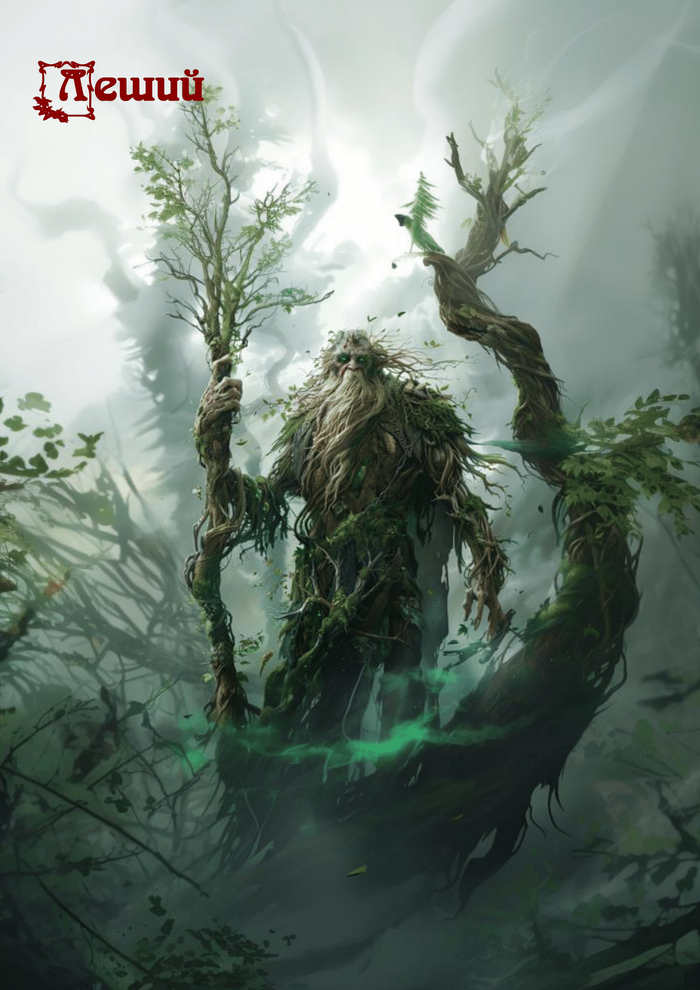Леший - загадочное и могущественное существо, хранитель леса из русского фольклора. Внешне он напоминает высокого, бородатого старика с горящими зелёными глазами и спутанными волосами, в которых запутались листья и ветки. Его кожа покрыта корой, а одежда сделана из мха и листвы.