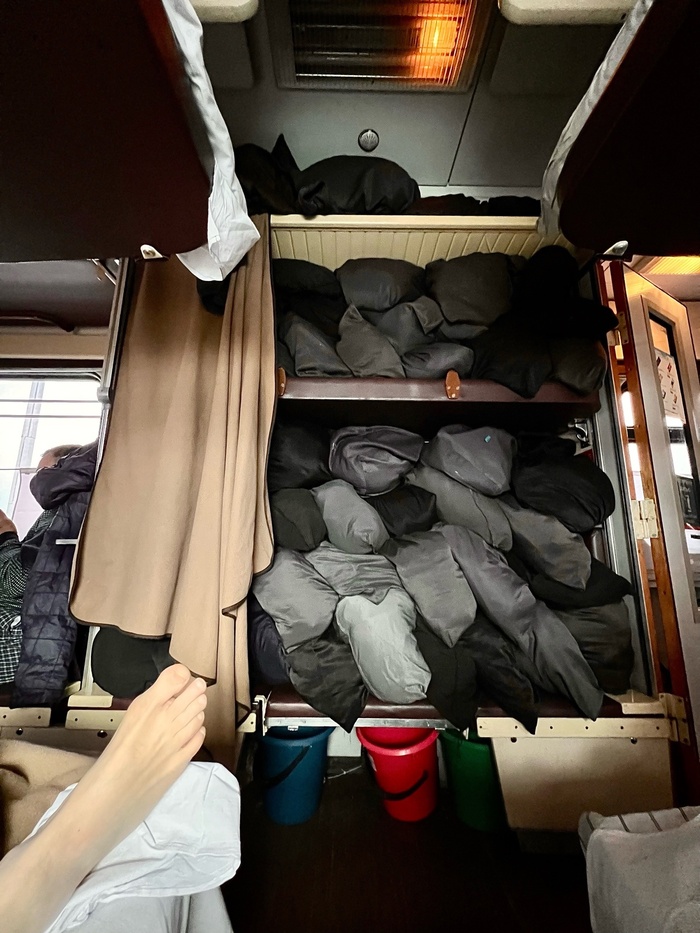 Наконец-то спустя месяц путешествия по железной дороге мы попали в по-настоящему «народный» поезд - нам достался вагон старого образца. Кроме угольного отопления, парового титана с водой, в нем самые обычные туалеты, которые закрывают перед станциями, чтобы соблюдать санитарные нормы. На этой части нашего пути мы узнали много от нашего проводника и попутчиков, а еще на наших глазах разыгрался целая драма спассажирами, полицией и обысками.