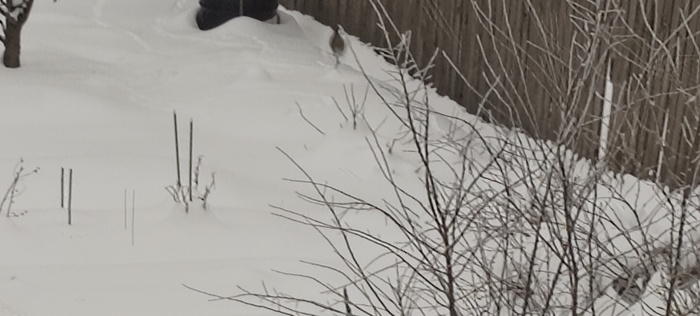 Сегодня задумал порядок в кладовке навести, слышу , брынькает телефон, ох, думаю, опять эти рекламщики, беру, открываю телеграмм, а там видео соседка прислала, на котором под моей кормушкой стая куропаток, срочно бегу к окну, ну вот, спугнул, ну ничего, ещё прилетят. Такие смешные птички, похожие на раздутые кувшины. Поднимаюсь на второй этаж, продолжаю делать дела, попутно наблюдая за гуляющим котом возле бани. Вдруг, смотрю в окошко, а там  одна куропатка вразвалку бегает туда-сюда, от бочки в кусты смородины. Видно,  что в кустах жилище  ихней семейки,присмотрелся и дорожка проторена, как раньше не замечал.За делами по дому время летит быстро, скоро и супругу с работы надо встречать, обед разогреть, а потом, вечерний променад с товарищем из соседней деревни.