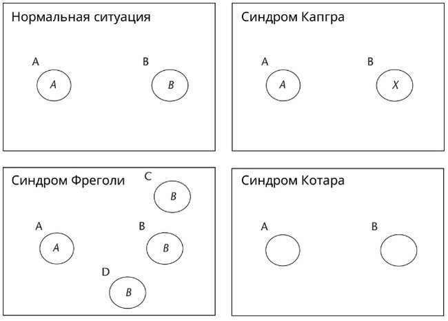 При синдроме Капгра – все так же, только человек В – непонятно кто, но не В.