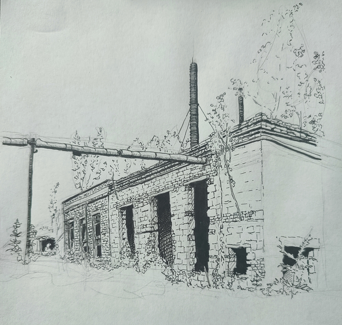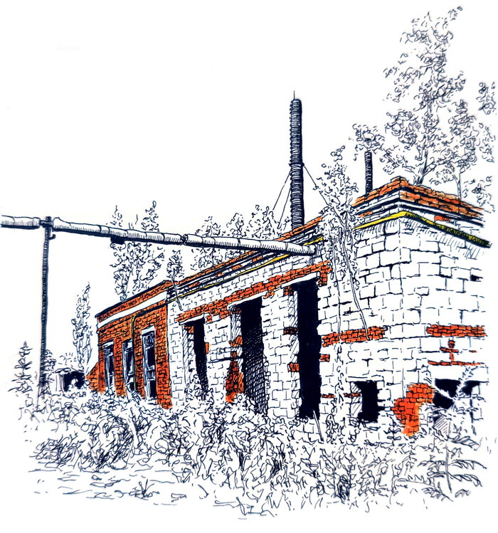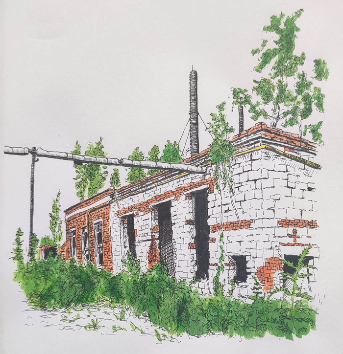 Сделать небольшой покрас. Сначала хотел выделить только трубу но в этом тоже не было бы ничего нового для меня. Поэтому я стал при помощи жёлтой, синей и красной туши (а точнее смешивая их) красить работу.