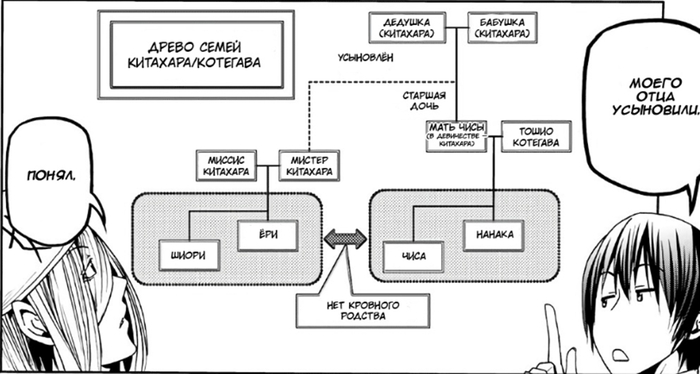Только если изменения отношений Сакурако к Иори произошли за 30 глав и нам это вкинули в лоб, то признание Чисой того, что Иори ей дорог, а следом и развитие этих отношений по капле капало 80+ глав, и нам не бросали это в лицо – нет, это долгое время прослеживалось в мелких поступках героев, а также мыслями и действиями Чисы на задниках юмористических сцен. И есть один персонаж, который это действительно замечал – Азуса. И ровно в тот момент, когда Чиса была готова признаться себе в том, что она привязана и влюблена в Иори, но только невозможность его потерять её останавливала, Азуса освобождает Иори от обещания. И первая же опасность потерять Иори заставила её действовать, а потом и признать причину своих действий.
