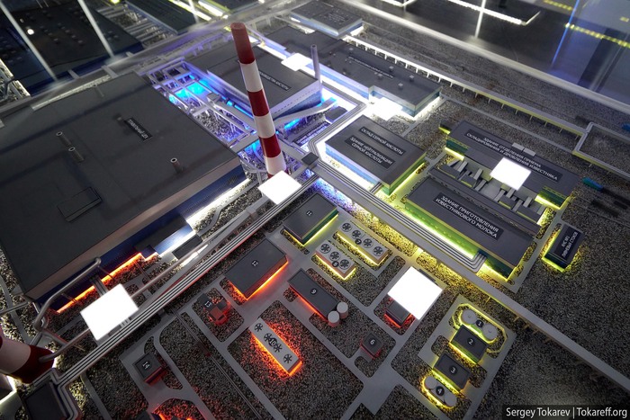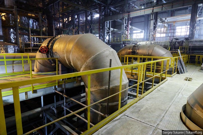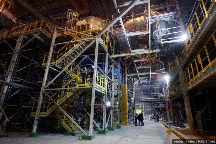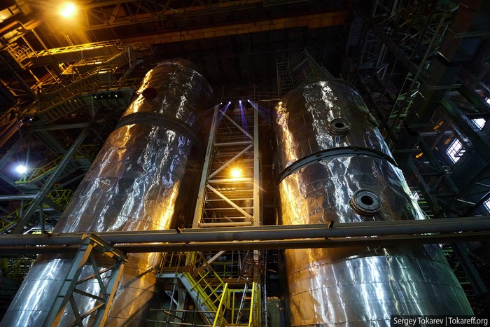 Так выглядит главный корпус цеха производства и нейтрализации серной кислоты, где происходит вся химия. Емкости высотой с многоэтажку, трубы, в которых может проехать машина, теплообменники весом в 200 тонн. И много чего еще. Обывателю непросто разобраться во всей это системе. Если упрощенно, в этих баках и трубах происходит следующее: