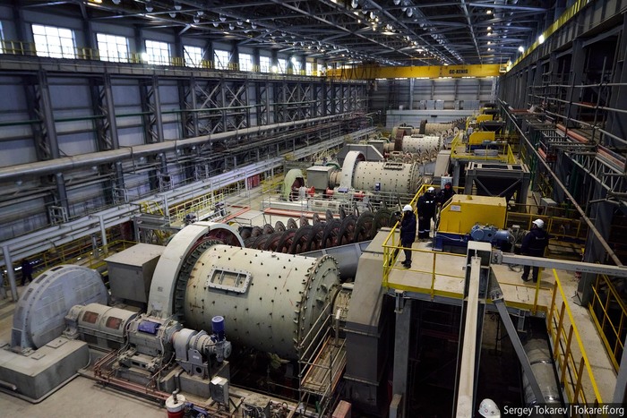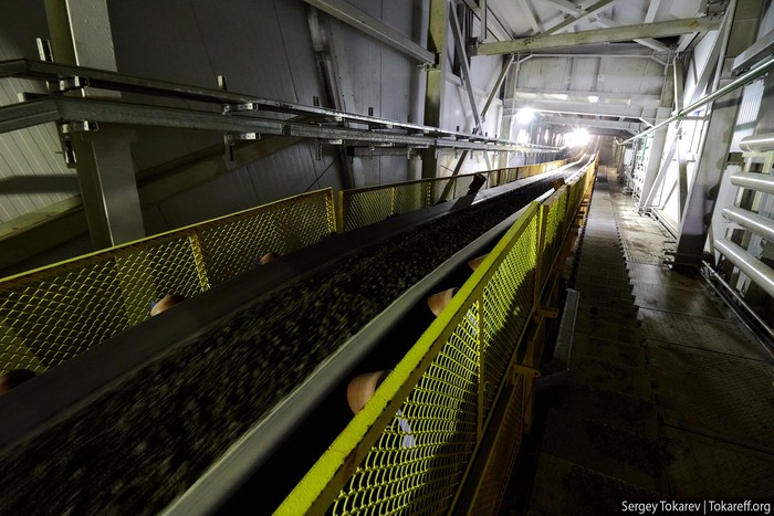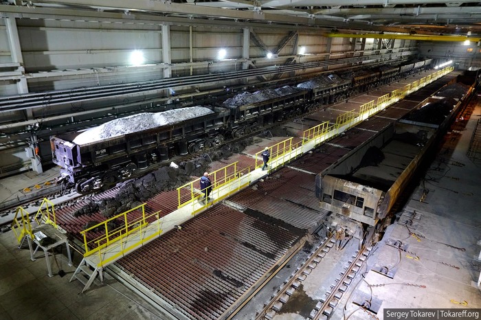 Здесь вагоны разгружают и материал по транспортной ленте поступает в цех с мельницами.
