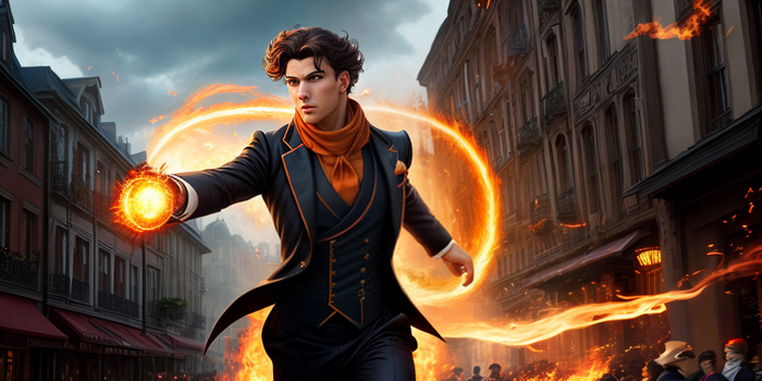 Примерно месяц назад меня попросили написать промпт для иллюстрации на обложку электронной книги. Ничего, в общем-то, необычного: молодой джентельмен на фоне языков пламени. После нескольких попыток и правок получилось вот это: