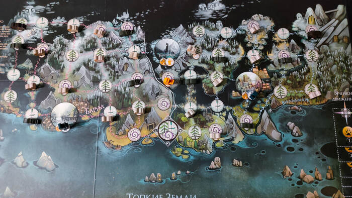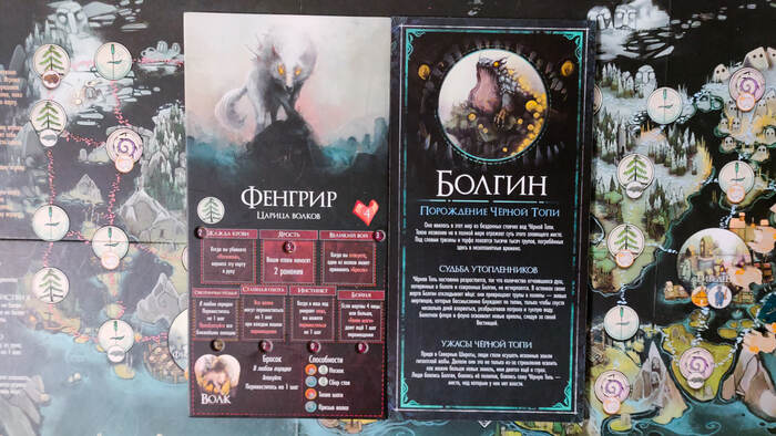 Иконографика здесь яркая и понятная даже без прочтения правил. Кстати, забыл упомянуть: если вам хочется побольше изучить лор игры – на обратной стороне каждого персонажа написано немного художественного текста, рассказывающего о бэкграунде персонажа. Так можно узнать, что Фенгрир приютила себе человеческого ребёнка, воспитав его как одного из своих волчат, а Ассар потерял всех своих родных, когда зверь Северных широт затопил деревушку, где он жил.