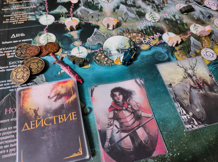Партия длится 3-4 (в зависимости от сценария) игровых суток. Здесь так называются раунды. Каждый из них делится на 3 фазы: утро, день и ночь. Утром вы драфтите карты, днём разыгрываете полученные карты и вечером восстанавливаете силы и прокачиваете персонажей. А теперь поподробнее о каждом времени суток.