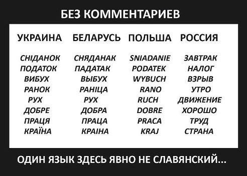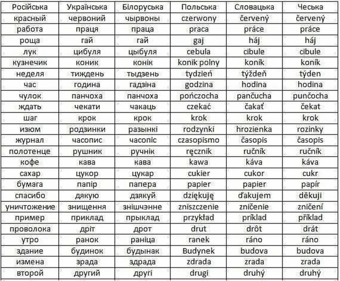 И так восемь из восьми слов которые отличаются от слов из украинского, польского и белорусского языков имеют славянское происхождение, что подтверждается этимологическими словарями. Т.е. таблица наоборот доказывает, что русский язык славянский ну перейдём к второй картинке подобного содержания