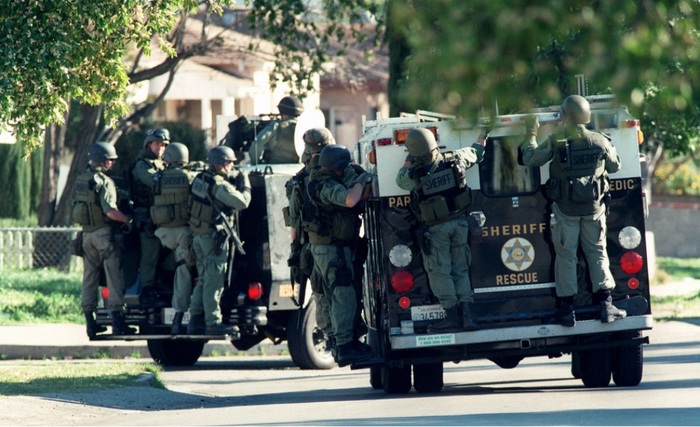 Конечно, получили сигнал тревоги и офицеры SWAT. Как вспоминал офицер Рик Масса, их с коллегой Стивом Гомесом выдернули с тренировки на стадионе; и если Рик успел надеть униформу, то у Стива даже не это не хватило времени- поэтому на видео последующих событий он так и попал- в каске, бронежилете, шортах и кроссовках. Вооружившись M-16, офицеры выдвинулись на Бульвар Лорел- Каньон [2].