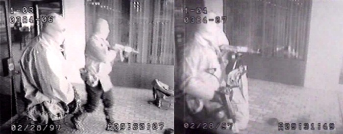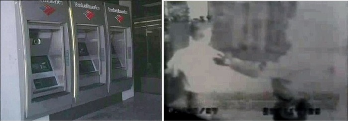 Филлипс открывает огонь из холла. Кадр из видеосъемки камеры банкомата [6].