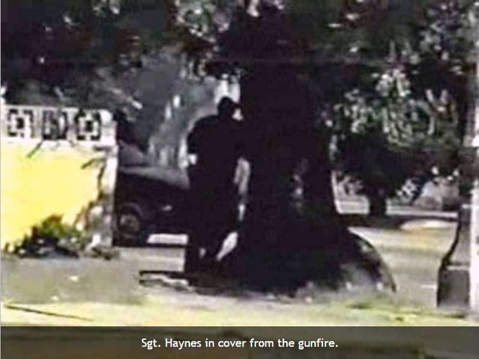 Выкрикнув короткое предупреждение остальным, сержант сграбастал Трэйси в охапку и повалился вместе с ней на асфальт, прикрываясь двигателем авто- единственным, что могло остановить пули АК. Обращенная к банку сторона машины с глухим стуком покрывалась пробоинами от пуль, колёса мгновенно пробило; брызнули осколками стёкла, осыпая Хэйнеса и прикрываемую им свидетельницу. «Мне показалось, что машина просто взорвалась…»- вспоминала Трэйси Фишер. Хейнес закричал двум другим свидетелям: «Всем лежать, не подниматься! Они давят нас автоматическим огнем!». Как ни старался уберечь девушку сержант, одна из пуль все же чиркнула по ее левой ступне… Еще один свидетель был ранен осколками разлетевшихся стекол [6].