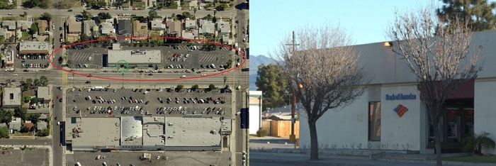 Слева- вид на северный вход в банк со стороны укрытия Гая, Зборована и детективов; справа- вид с места, где стоял Ларри Филлипс, на киоск и автостоянку торгового центра, где пытались укрыться полицейские.